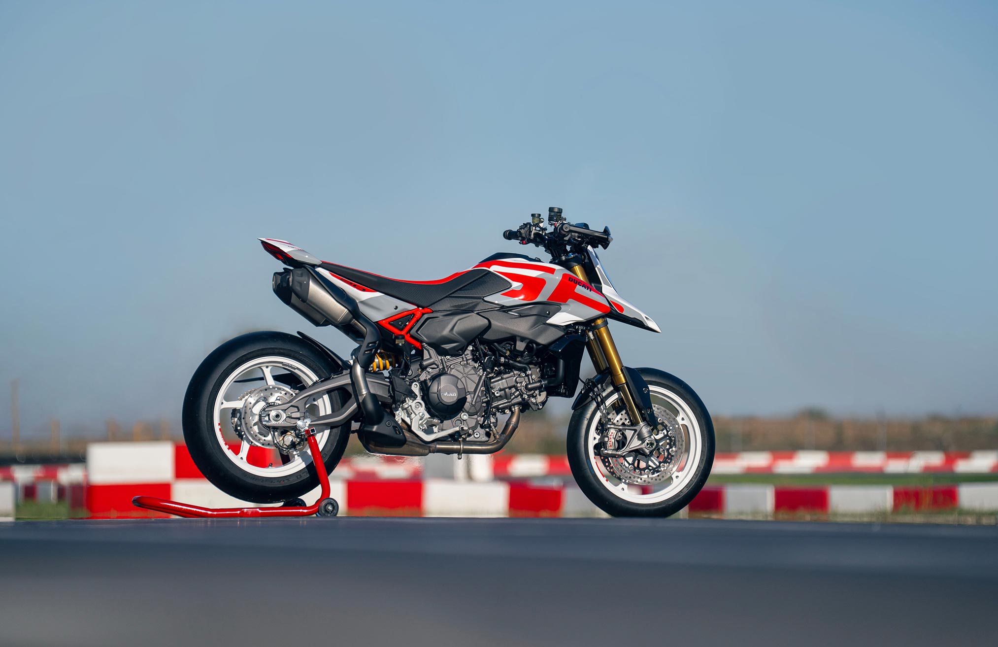 The SP version is even bolder, thanks to the oversized logo that extends to the beak, contrasting with the white forged wheels and racing details such as the carbon mudguard, the gold Öhlins suspension, and the Brembo M50 calipers. In addition to the dedicated livery, which references the 20 years since the first prototype was created, the Hypermotard V2 SP also features technical features that push the Hyper’s fun bike character even further.