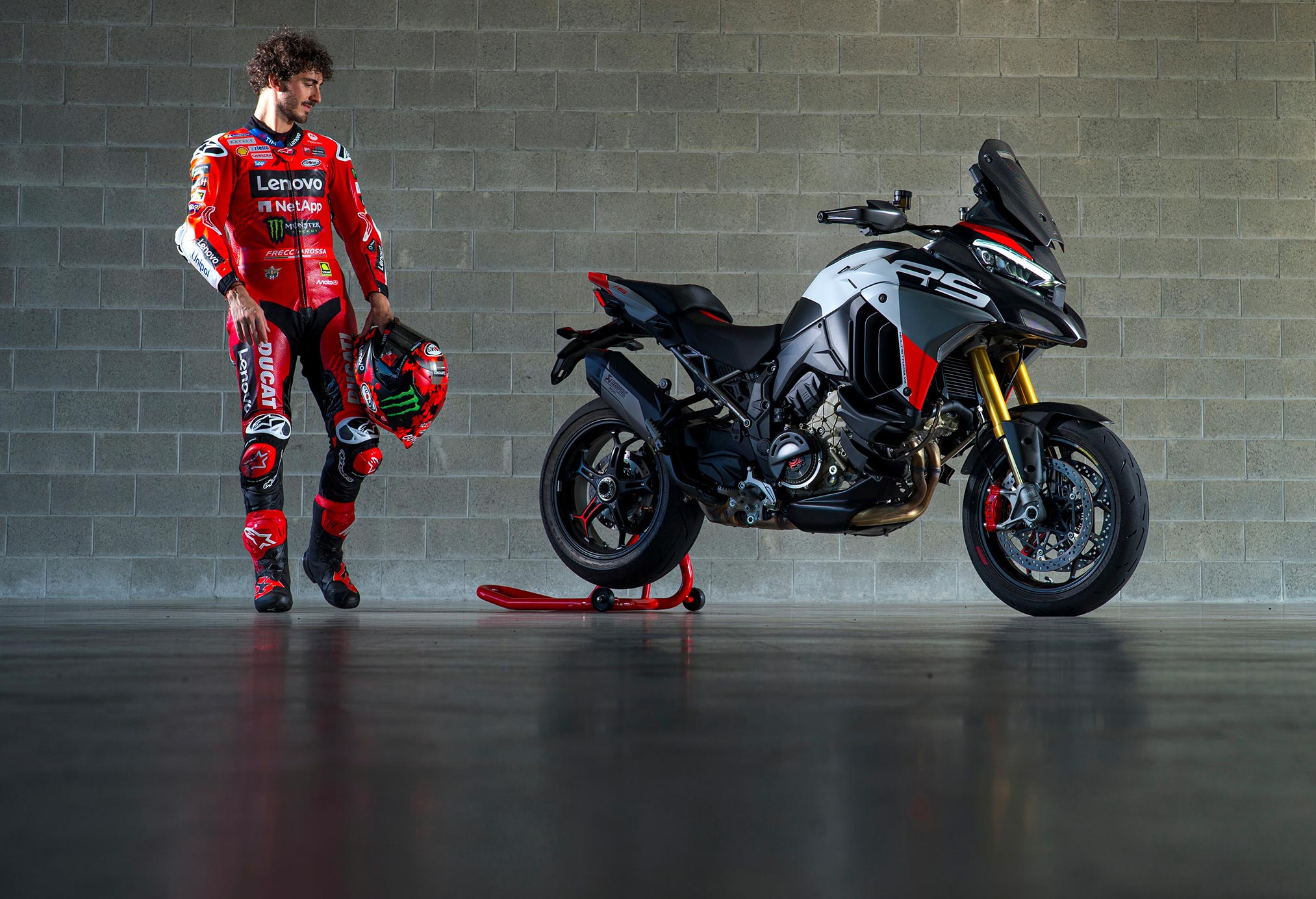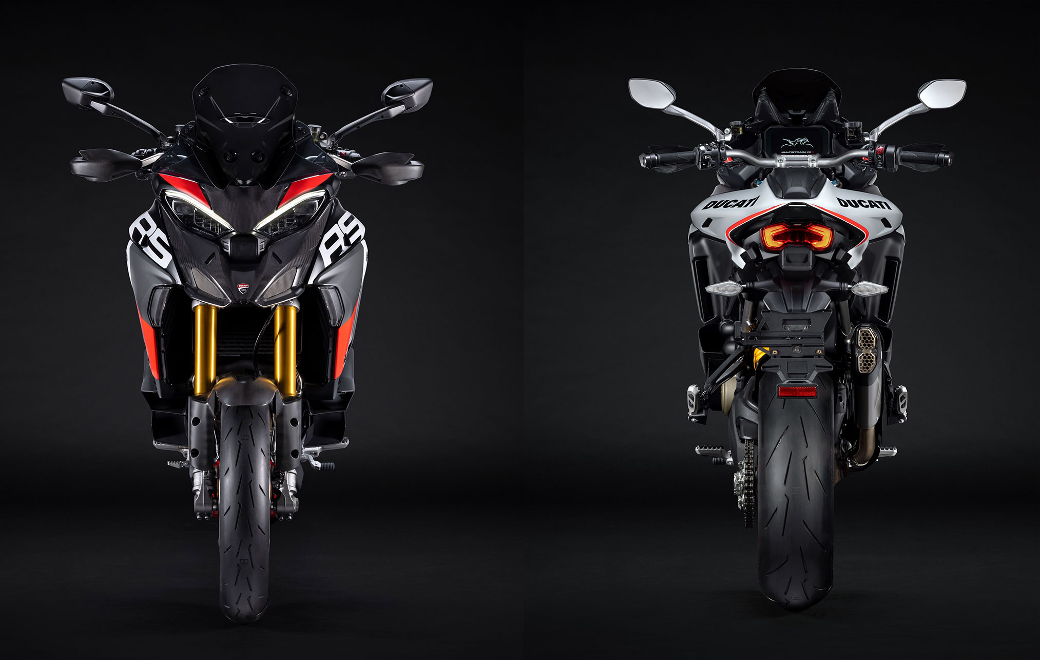 Öhlins Smart EC 2.0 electronic suspension, Ducati Quick Shift, Hands-free, Backlit handlebar switches, 6.5″ TFT colour display with Ducati Connect and full-map navigation system, Full LED headlight, Carbon fibre front mudguard and beak, Carbon fibre handguards, Type-approved Akrapovic muffler