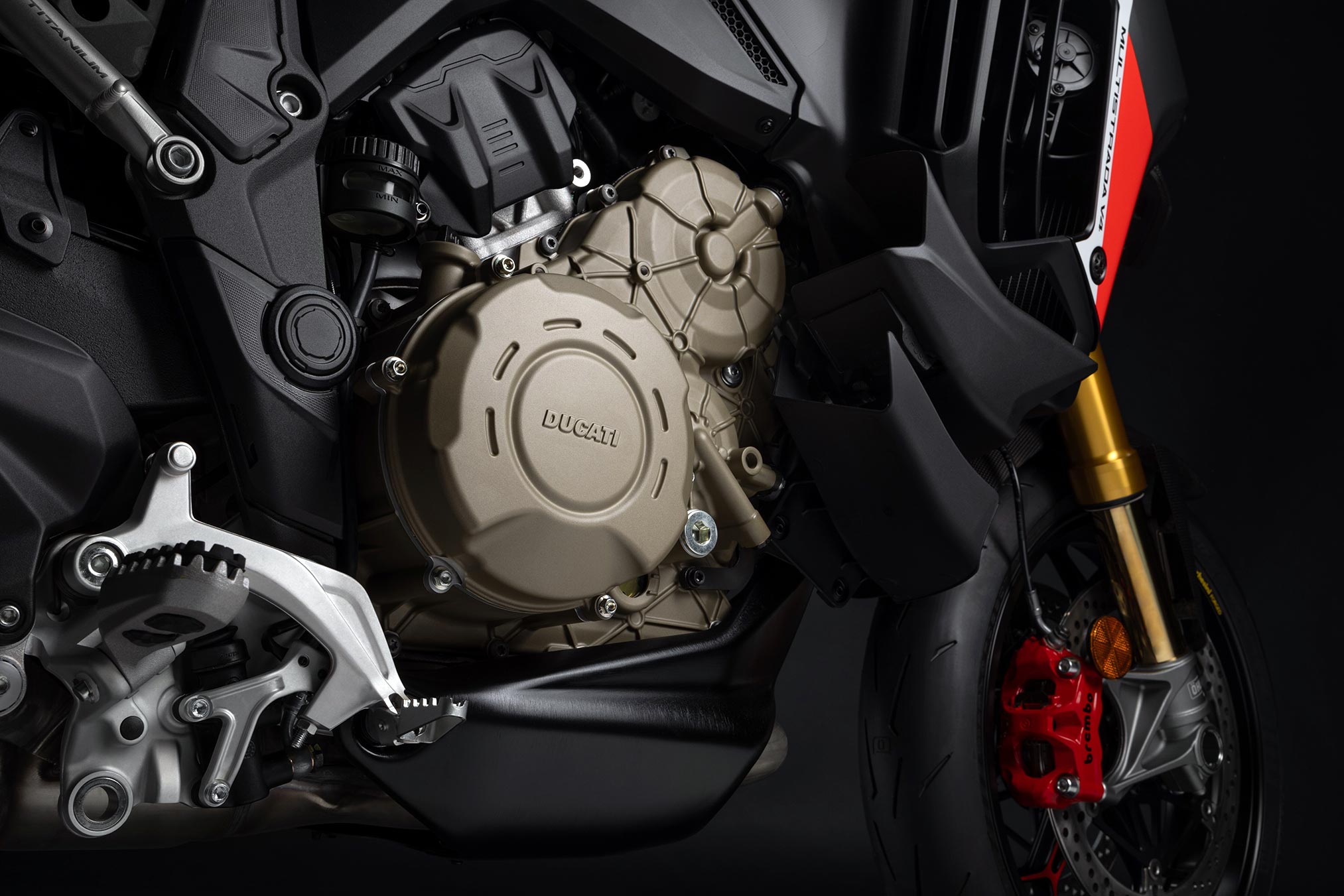 The Desmosedici Stradale engine develops a maximum power of 180 hp, with a rev limit of 12,250 rpm. This figure was chosen to ensure sporty performance while maintaining the balance that has always distinguished the Multistrada V4 since its first version.