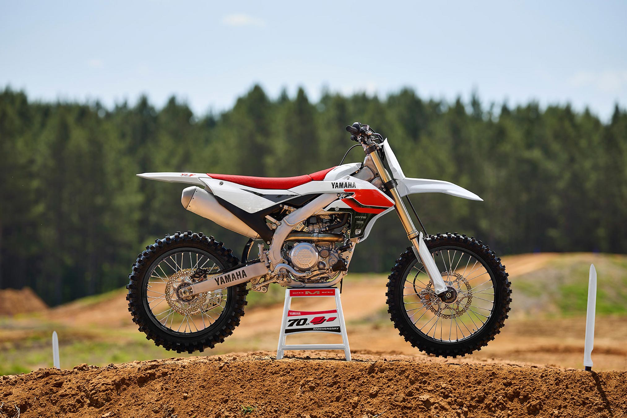 Iconic white and red 70th Anniversary Edition livery combines with the YZ450F’s aggressive bodywork for a stunning look.