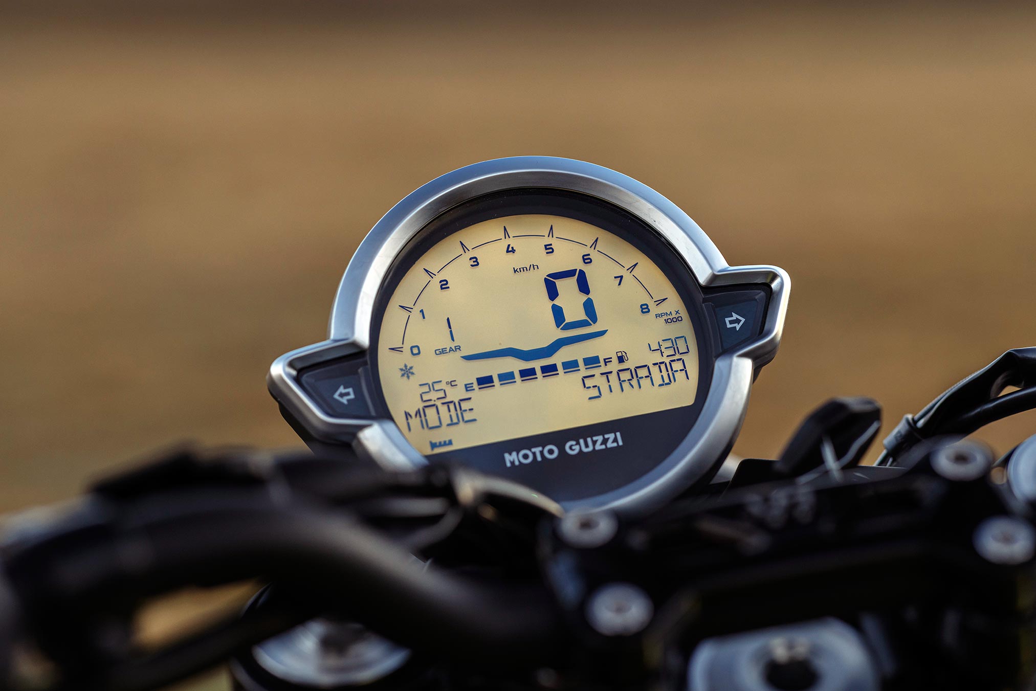 Operated by convenient new switch cubes the single round LCD instrument cluster, standard across all models, has updated graphics and additional features, such as the selected riding mode and speed setting via Cruise Control. The V7 Sport also includes a fuel level indicator.
