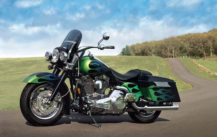 As anyone who loves logging miles will tell you, the Road King® motorcycle is one roadworthy piece of machinery. Check out the bold, strong profile. Full fenders. Large chrome headlight and nacelle. Two-piece throne. And the always ready Twin Cam 88® engine residing in the center. The wrinkle black and chrome V-Twin comes in your choice of carb or EFI. We isolation-mounted it so you can ride for miles on end. And there’s an air-adjustable suspension and refined chassis so each and every mile is pure joy. The fresh new tank graphic is fit for a king. We also gave this royal ride some practical features like a detachable windshield and weather-resistant, lockable saddlebags. There’s no denying Road King has earned the road’s respect. Only question left is, Which roads are worthy of the Road King?