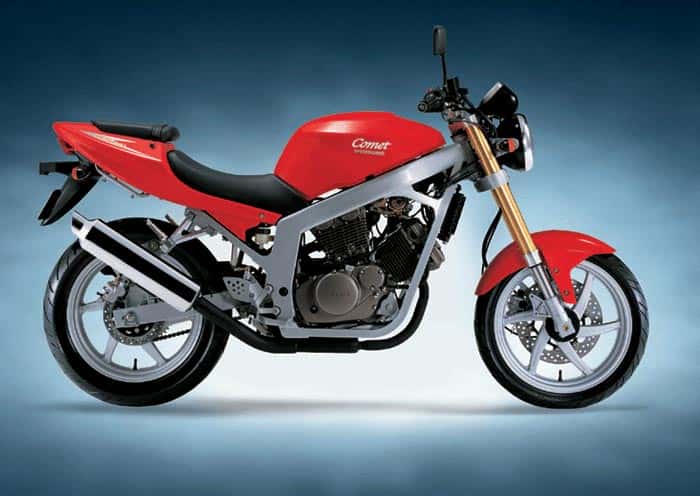 The comet 250 comes standard with huge front disc brake with twin piston fully floating caliper. A twin disc kit is available as an option for racing use. A six spoke alloy wheel and tubeless tyre are suspended by High tensile upside down forks which have been tuned in Australia by grand prix specialists to give optimum street performance with plush, sensitive response and race worthy performance.
