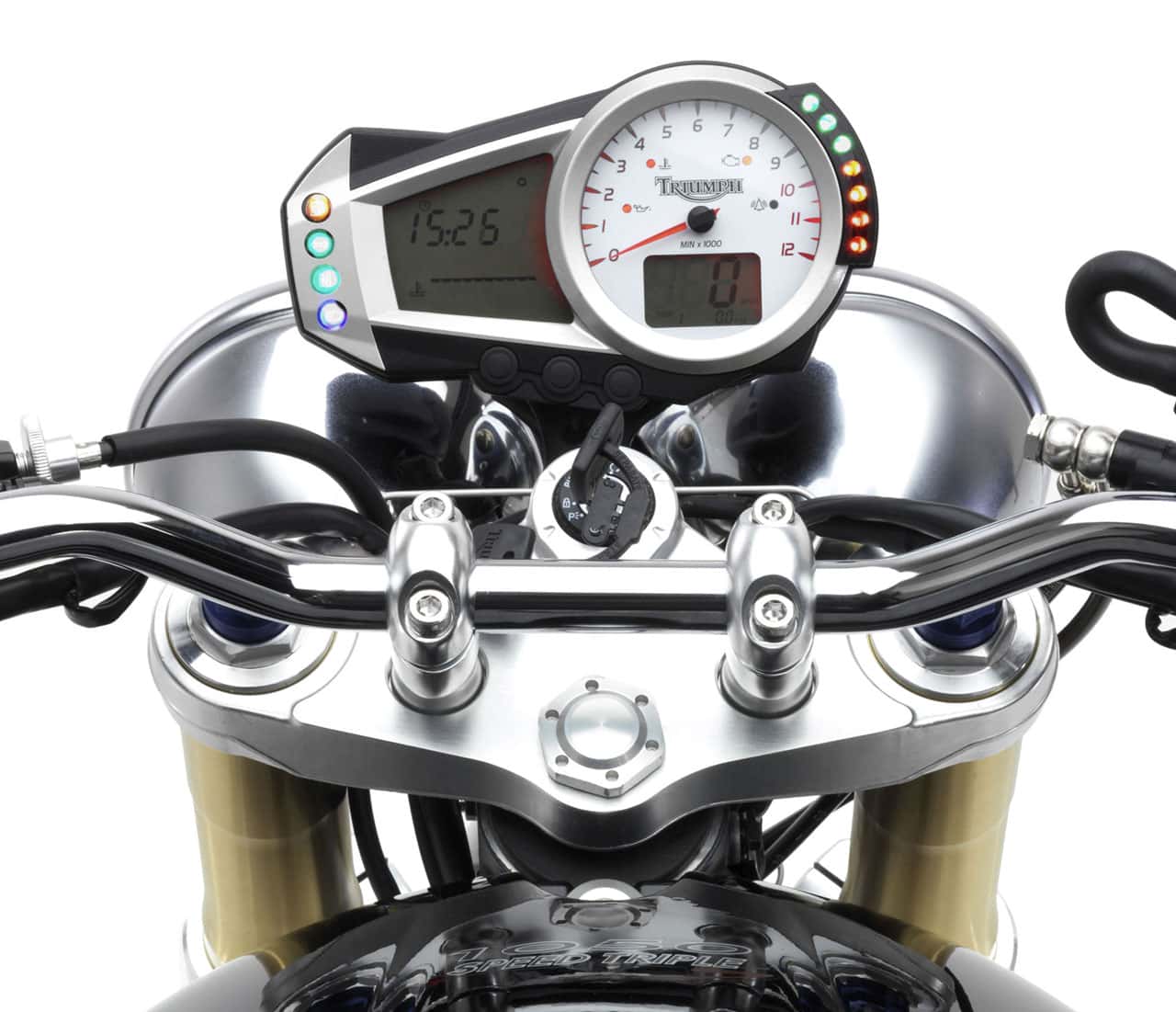 Containing the engine is a completely revised chassis. A rigid aluminium frame provides massive strength with steering geometry that gives fast-steering neutrality plus great stability. The fully adjustable 45mm upside down forks and rear monoshock have been specifically developed for the Speed Triple and bring new levels of quality and compliance.