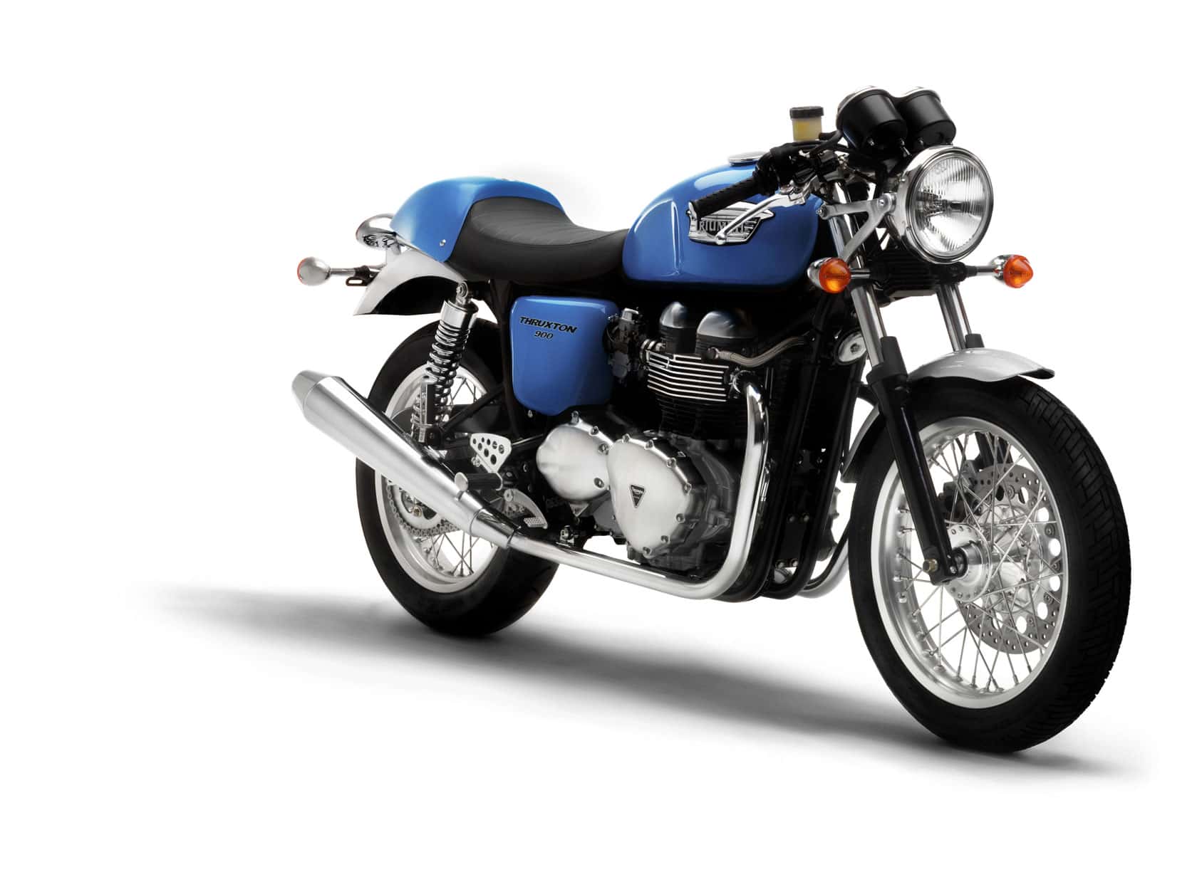 Colour options available are Jet Black plus, new for 2005, Racing Yellow and Caspian Blue all with a chequered flag tank graphic and silver mudguards. A comprehensive range of accessories, including less restrictive silencers (not for use on the road), fly screen, soft luggage and various chrome additions further enhance the Thruxton’s scope for owner involvement and personalisation.