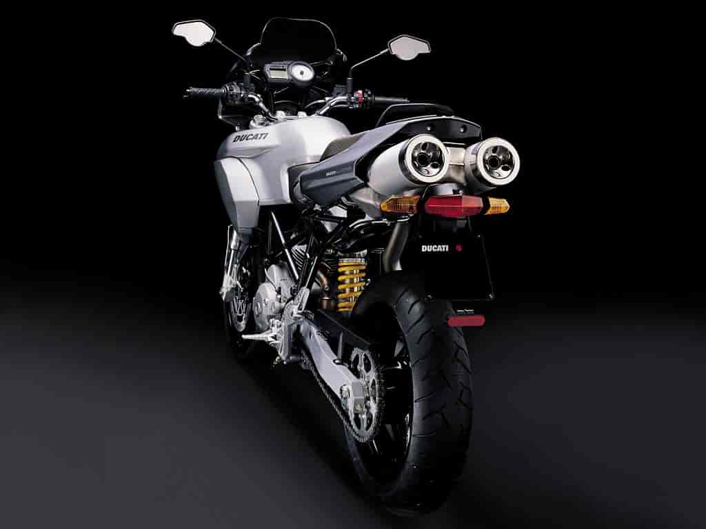 The bodywork of the Multistrada (the 620 cc models are simply named “Multistrada” without any reference to engine size) is substantially similar to that of the 1000 cc version, but many chassis components are dedicated parts. Examples include a hydroformed double sided swingarm similar to that of the Monster, and die-cast footrests that integrate rider and passenger pegs in a one-piece casting. Though these components distinguish the smaller models, all Multistradas share the same overall styling and you have to look under the skin to find the real differences. The reduced fuel consumption of the 620 models allows tank capacity to be reduced to 15 litres, more than enough for excellent range even without the under-tail tank. These savings are reflected in the low price of the entry level Multistradas. The instruments are dedicated units too, and are more conventional, without some digital functions. Other features of the models powered by the 620 cc powerplant are a handlebar-mounted choke lever and three-spoke alloy wheels. The Multistrada Dark, the matt black version with the lowest price of all is also distinguished by a large diameter, single disc front brake that enhances the bike’s minimalist supermotard looks.