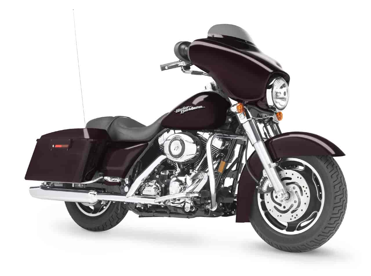 Streamliner footboards, brake pedal and passenger pegs add to the Street Glide custom styling. A stretched, chrome fuel tank console features a special smoked-chrome emblem. The style and performance combines for a lower, lighter and cleaner touring motorcycle that rides proudly with its Electra Glide heritage. The Street Glide is available in six solid colors: Vivid Black, Black Cherry Pearl, Black Pearl, Deep Cobalt Pearl, Pacific Blue Denim and Pewter Denim.