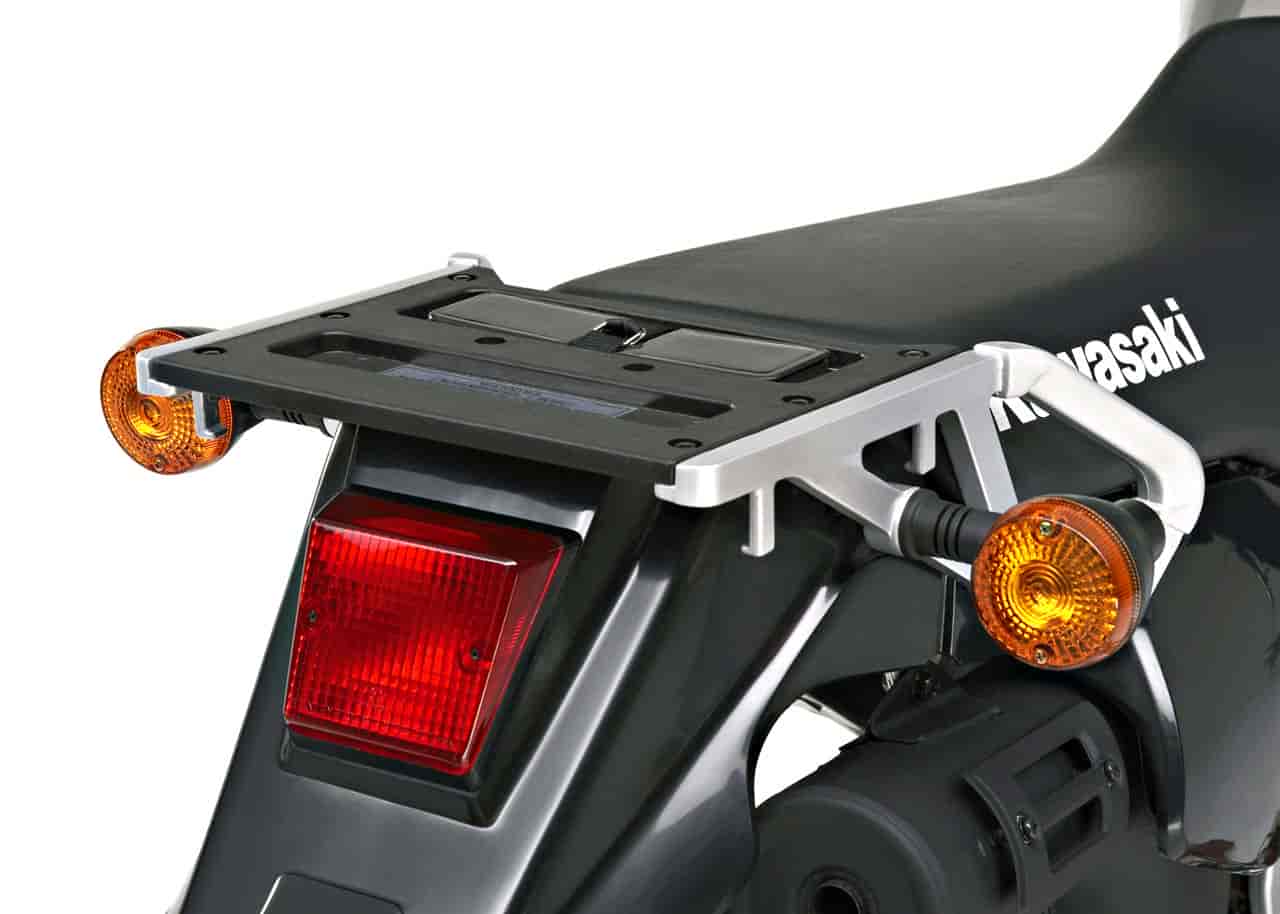 A U.S. Forest Service-approved spark arrestor provides access to any road open to licensed vehicles, while a sturdy engine guard protects the engine from loose rocks and gravel. With an optional Kawasaki tank bag and soft luggage on the large standard rear rack, KLR650 owners can tote enough gear for an extended trip to any remote location.