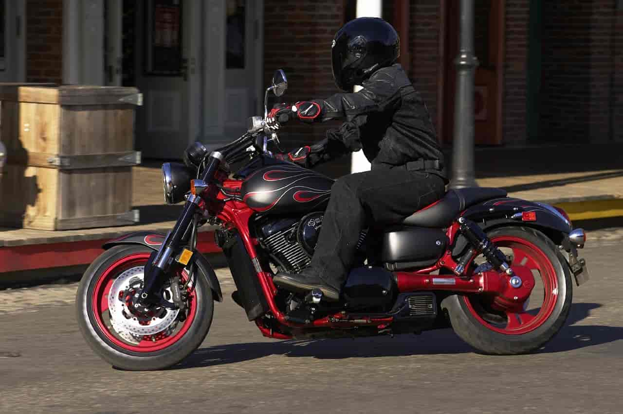 Unlike most cruisers, the Mean Streak enjoys nimble handling with excellent high-speed stability. Sportbike-style 43mm inverted forks and a reinforced swingarm with dual air-assisted hydraulic shocks aid handling, while still offering enough compliance to offer the smooth journey demanded by cruiser riders. Dual radial-mount front disc brakes and four-piston calipers lend additional street credibility and excellent stopping power to the Mean Streak’s bag of tricks.