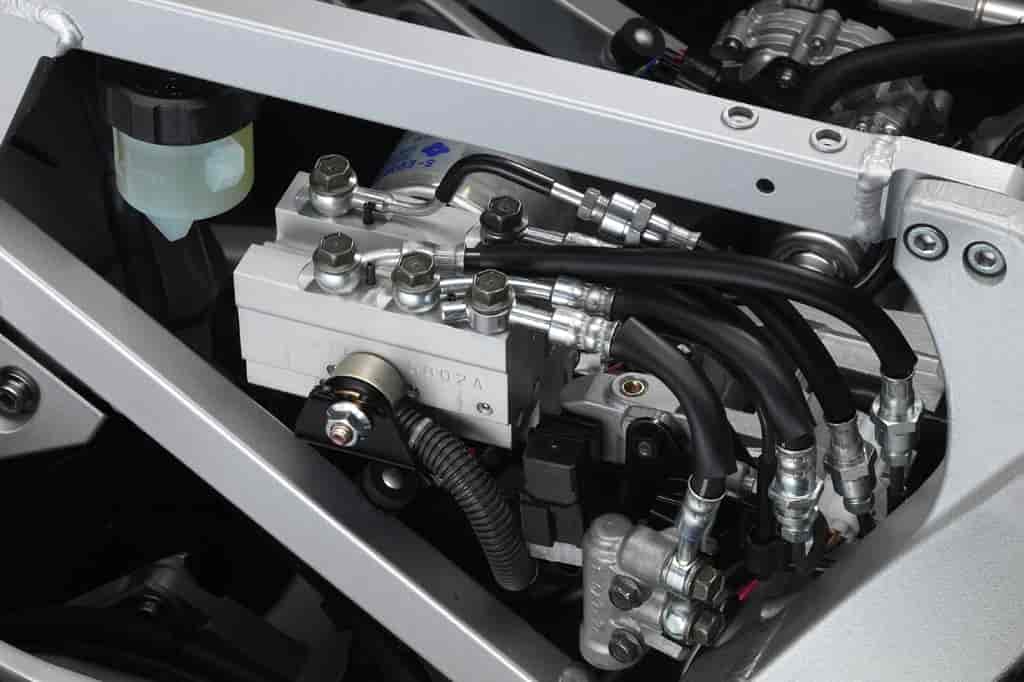 – Unified braking system with computer controlled ABS. When the front brake is applied, all 4 – LHS front caliper pistons are activated, while only the “upper” two pistons on the RHS front caliper are activated. When applying the rear brake, both rear caliper pistons are activated plus the two lower pistons on the front RHS caliper are activated.