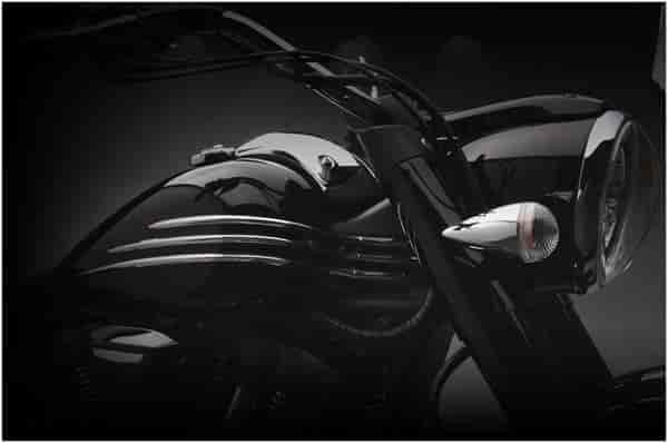 – Flangeless teardrop style fuel tank offers 14 liters of capacity. This is the first flangeless tank used on a Yamaha cruiser. There are no welds visible, providing that custom look. The total fuel capacity is 17 liters thanks to a 3 liter sub tank located low in the frame below the seat. A high pressure electric fuel pump with quick connect fittings provide fuel to the EFI system.