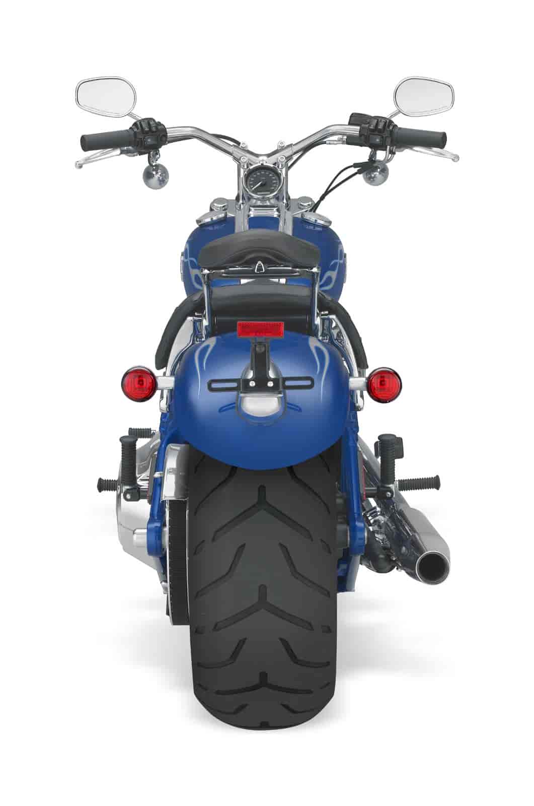 A sculpted, two-piece five-inch curved riser supports independent, V-Bar handlebar with internal wiring. A new bullet-shaped headlamp rides over beefy 49 mm Showa forks. The bullet-style turn indicators feature bright LED lamps. The new Stop/Turn/Tail lights incorporate the stop and tail lamp functions with the rear turn indicators, eliminating the traditional tail lamp from the rear fender. A stretched, five-gallon fuel tank holds a low-profile console with a polished aluminum insert, integrated indicator lamps and an angled, speed-shop style speedometer housing. A machined 3-D Bar and Shield medallion is mounted in a deboss on each side of the fuel tank.