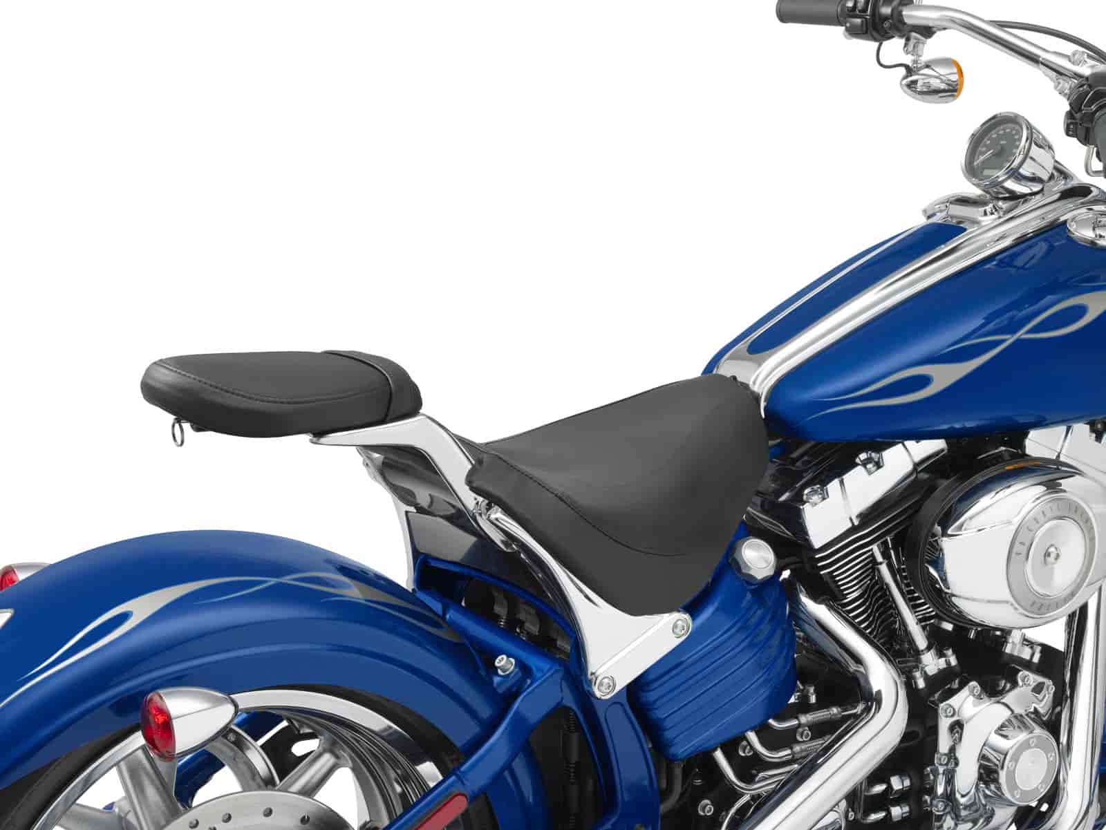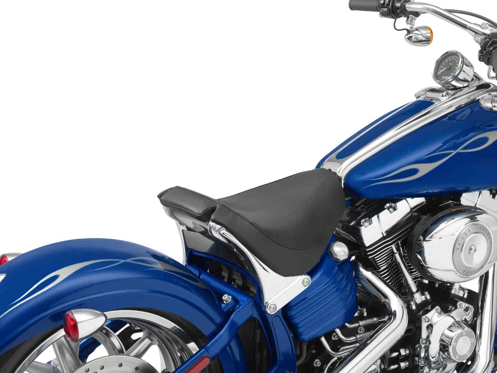 Passenger pegs are a clue to a surprising feature of the Rocker C. The industry-first Trick solo seat completely conceals a passenger pillion and struts that deploy over the rear fender without tools. When someone needs a lift, simply lift off the main seat cushion and fold out the pillion on its chrome plated struts. The pillion is independent of the fender, which can still move through the full suspension range. For solo riding, the pillion stows away out of sight. The Rocker C is available in three solid colors with pinstripe flames: Vivid Black Deluxe, Pacific Blue Pearl Deluxe and Crimson Red Sunglo Deluxe.