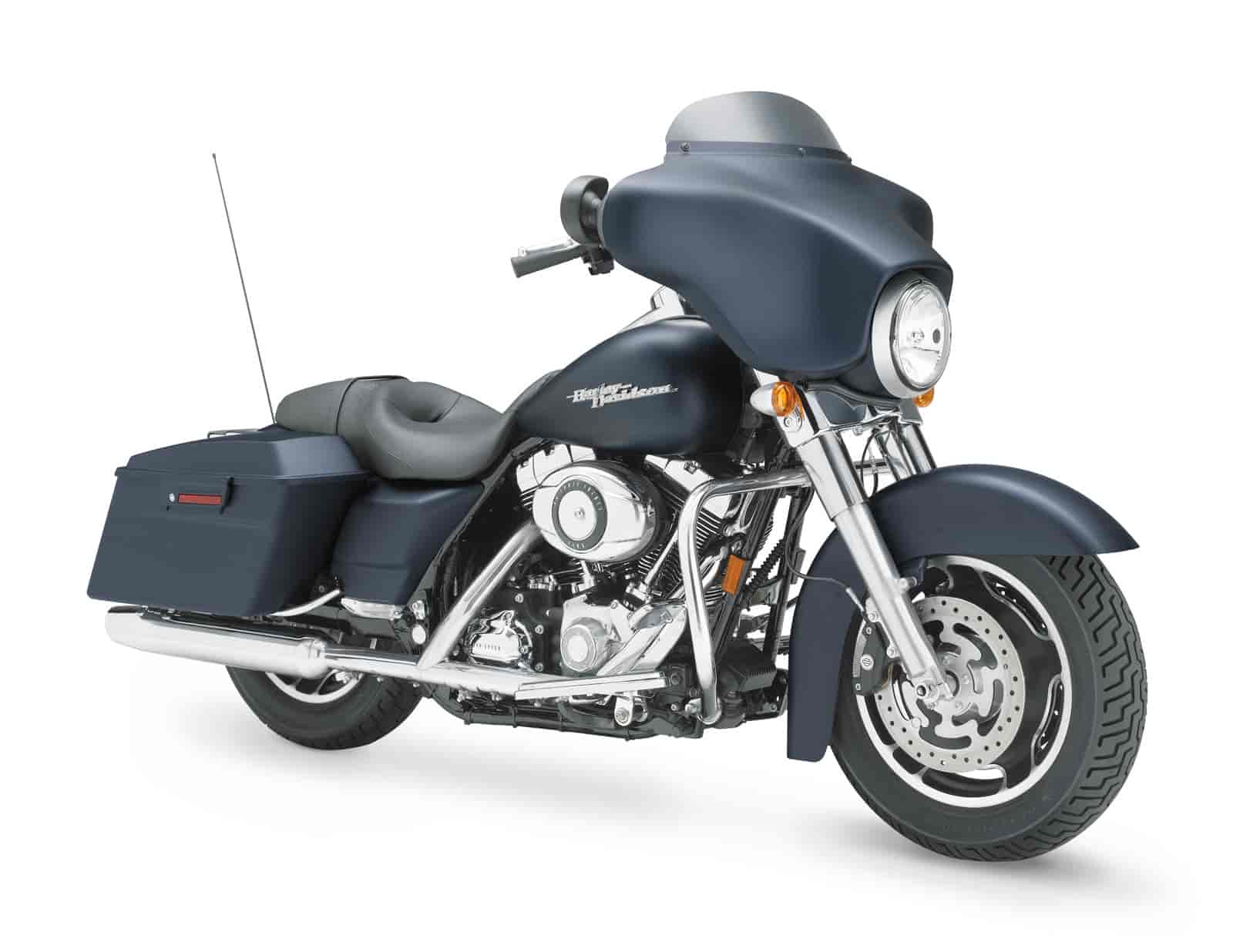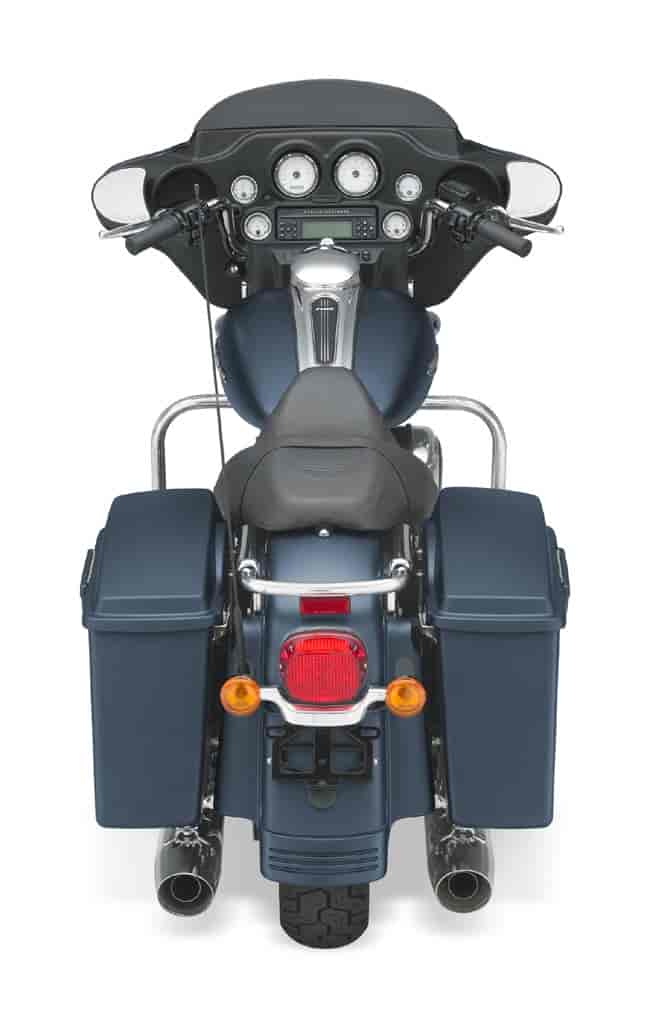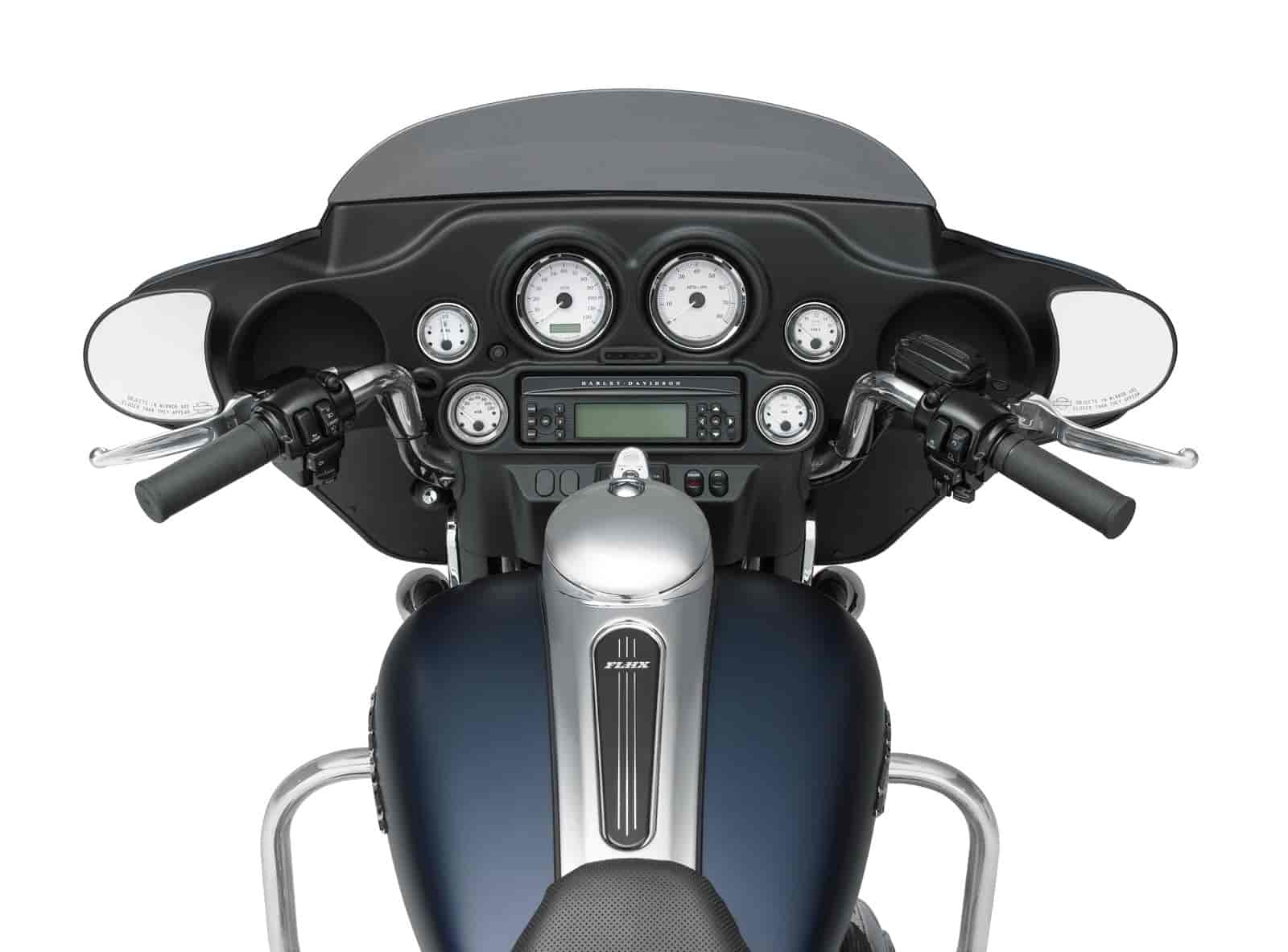 A custom for the long haul, the FLHX Street Glide offers the comfort and function of a dresser with stripped-down styling. Lowered rear suspension, a smoked mini-wind deflector, and Tri-line LED lighting at the bottom of the rear fender gives the Street Glide a low, lean profile. A traditional “bat wing” fairing holds a 40-watt Advanced Audio System by Harman/Kardon, while a new, shorter antenna streamlines the look. A new stretched, chrome fuel tank console and Streamliner footboards, brake pedal and passenger pegs finish the custom treatment.
