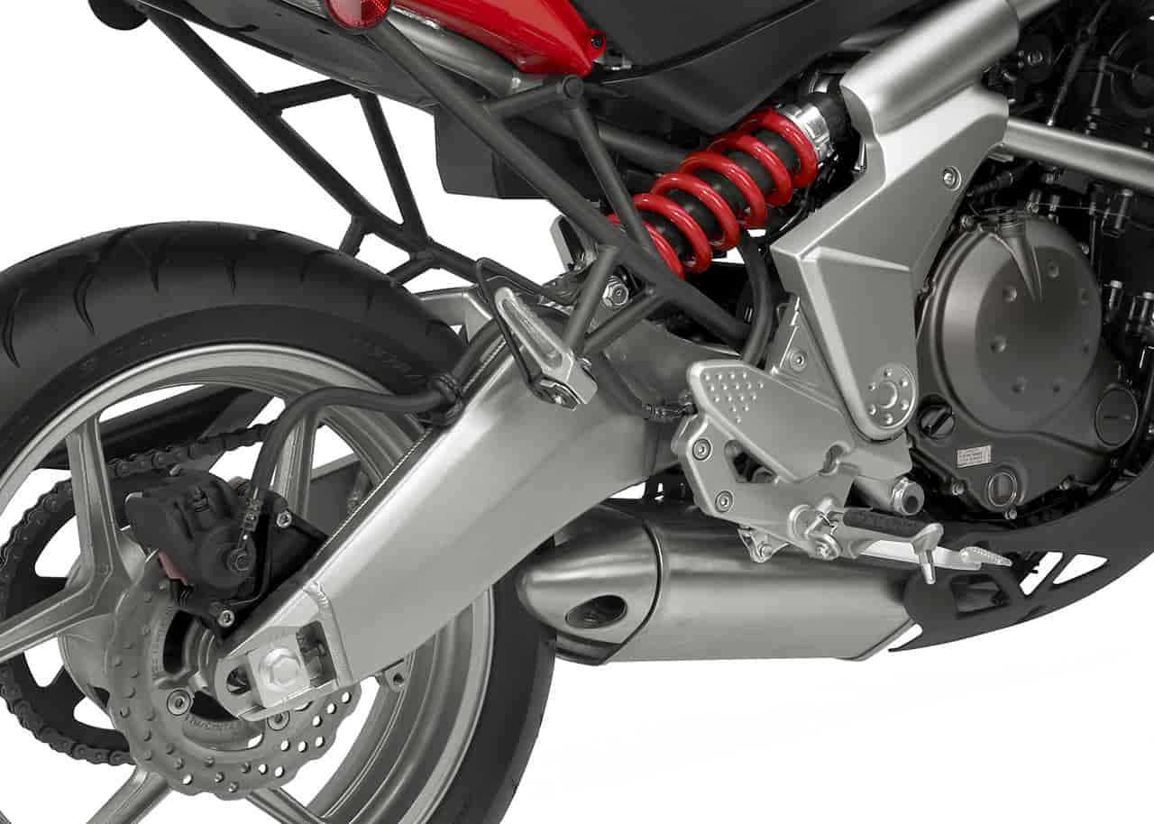 Aluminum gull-wing swingarm and offset, laydown single rear shock complement the frame design to create an integrated line flowing from the steering head to the rear hub