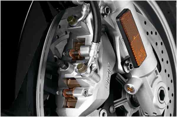 Unified braking system with computer controlled ABS. When the front brake is applied, all 4 – LHS front caliper pistons are activated, while only the “upper” two pistons on the RHS front caliper are activated. When applying the rear brake, both rear caliper pistons are activated plus the two lower pistons on the front RHS caliper are activated.