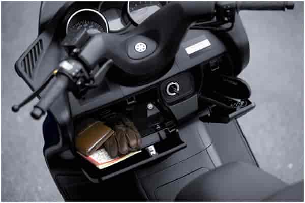 Additional storage can also be found in the front area of the rider cockpit. There is one larger lockable compartment and one smaller non-lockable compartment.