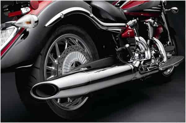 High-performance, 2-into-1-exhaust system features large size header pipes for maximum flow. The single muffler contains a 3-way honey comb matrix catalyizer to reduce harmful exhaust emissions. The stylish muffler helps to boost torque and horsepower while producing a throaty, V-twin growl.