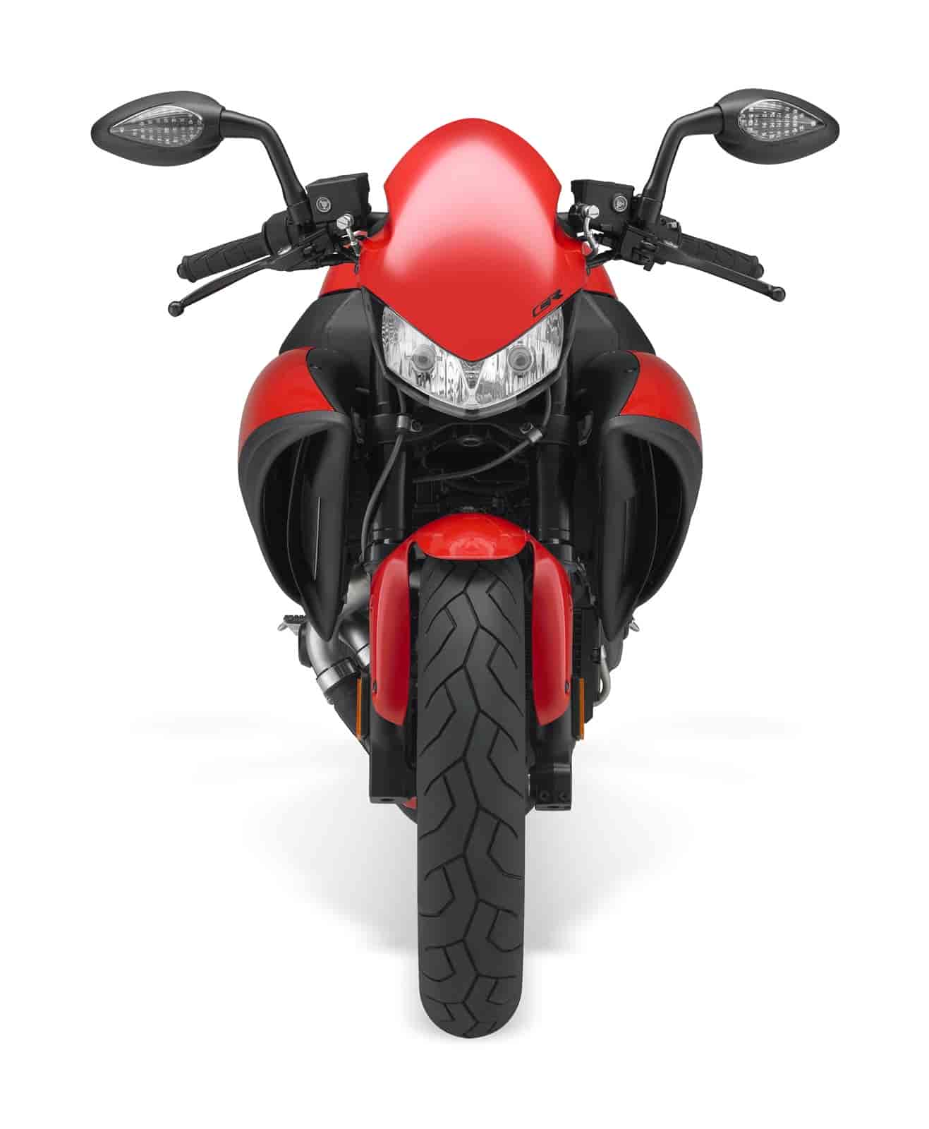 Positioned behind the black-anodized, tapered aluminum clubman-style handlebar and streamlined headlight and flyscreen, the rider has a wide-open view forward that intensifies the sensation of speed. With a dry weight of 375 pounds, the 1125CR is the lightest liter-class streetfighter on the market, and combined with 146 horsepower, it offers the best weight-to-horsepower ratio in the category.