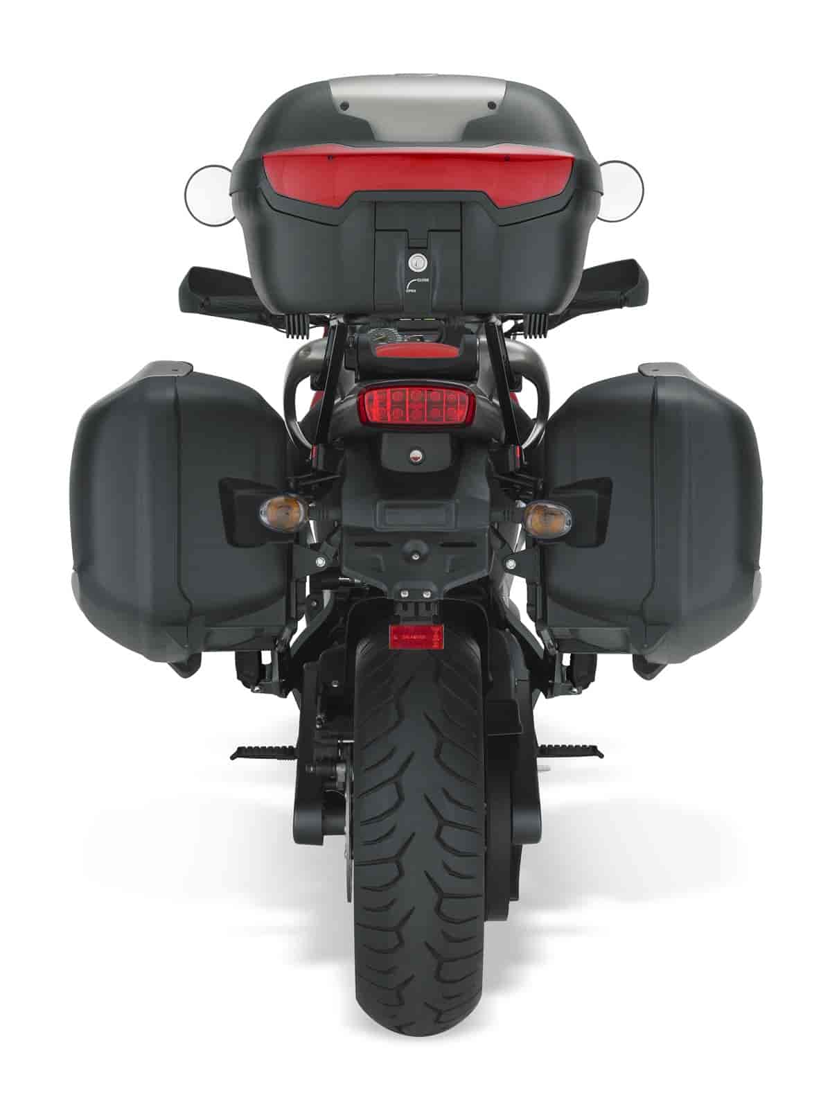 The XB12XT places the rider in a comfortable, upright position behind wide handlebars with wind deflectors and a tall, two-piece windscreen. Removable hard-shell side cases and top case are standard equipment. On the XB12XT, the Triple Tail system functions as a luggage rack with tie-down hooks over the rear seat position or a as a cushioned passenger backrest with grab rails. The XB12XT is offered with Racing Red or Thrust Blue bodywork.