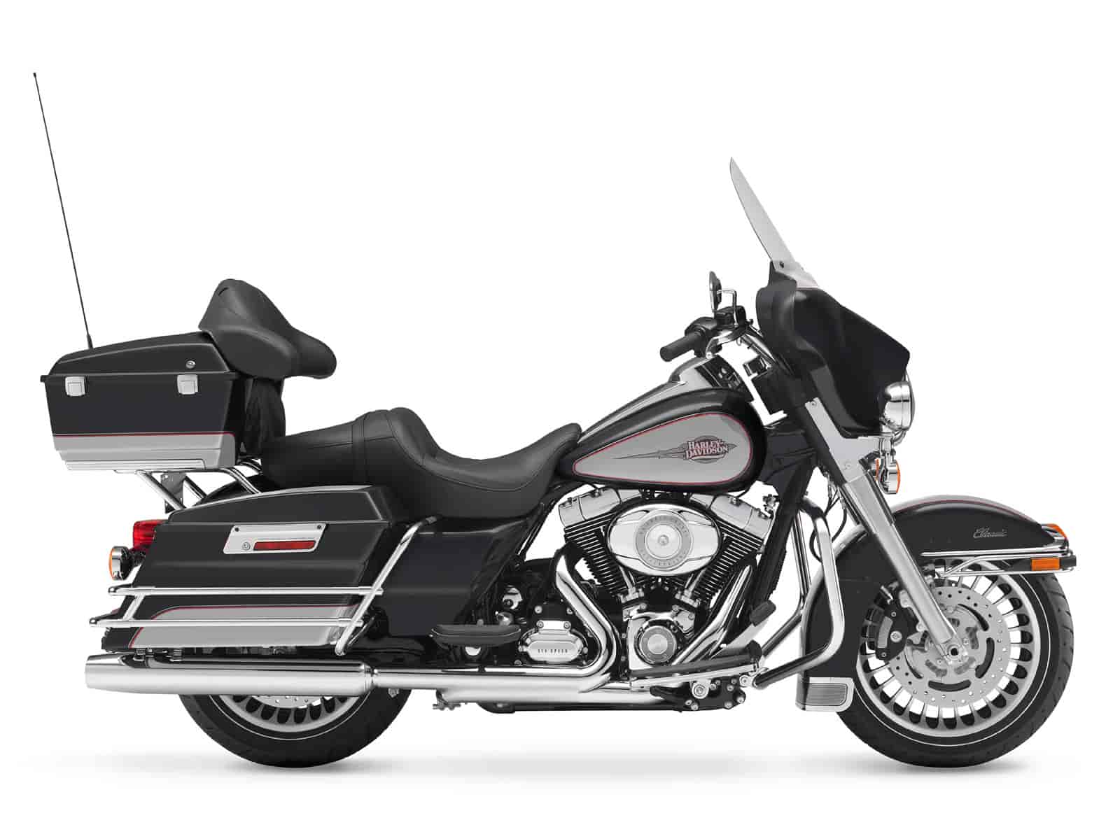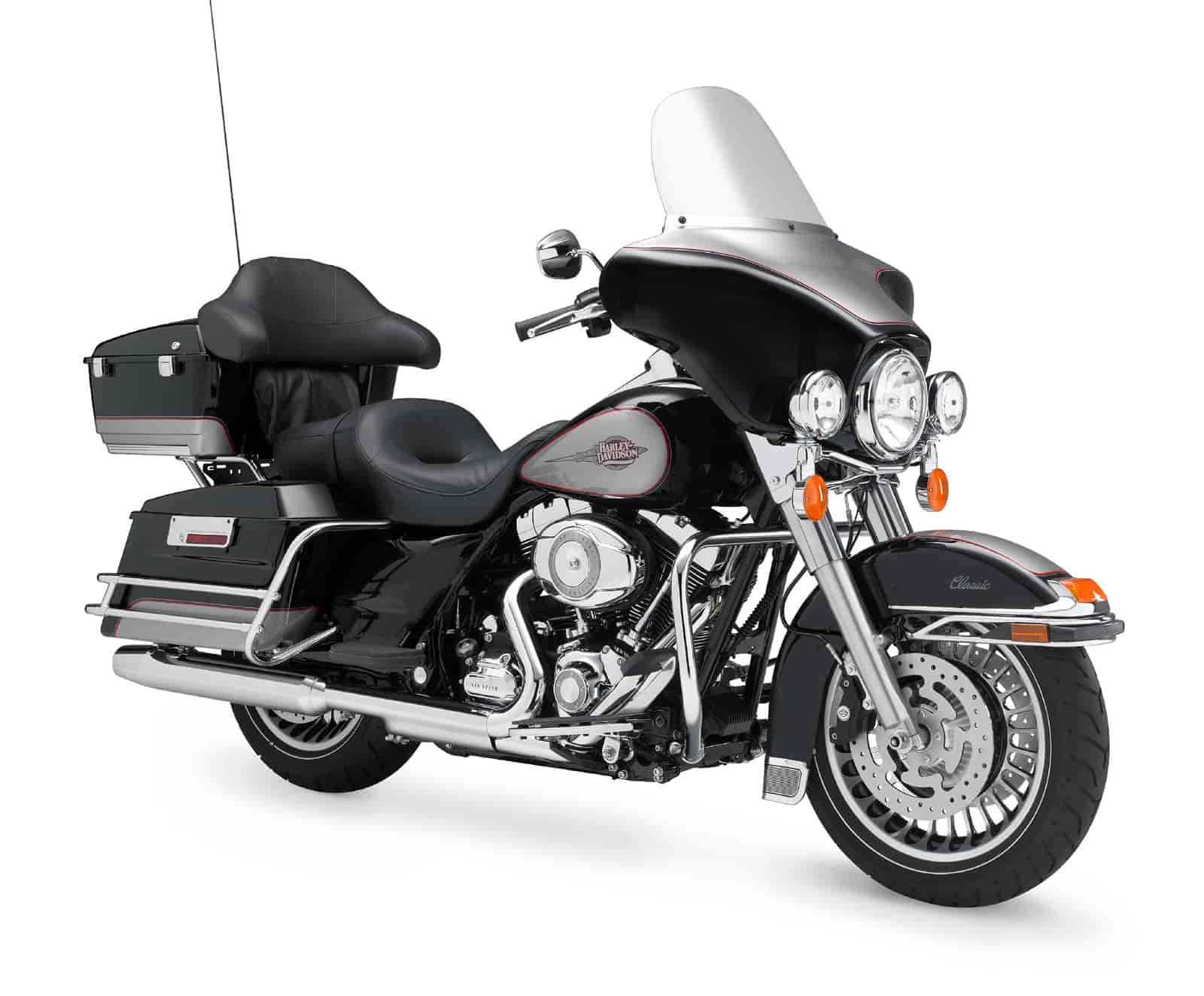 Go beyond the touring basics aboard the Electra Glide Classic, which comes equipped with an adjustable Tour-Pak, 40-watt Advanced Audio System by Harman/Kardon, and full instrumentation, plus additional fender and saddlebag trim, for beyond-the-basics touring comfort and versatility. New for 2009 is a brighter, long-lasting LED rear fender tip light and a shorty radio antenna that will clear a seven-foot garage door. The Tour-Pak rack has been redesigned with no pierced holes in the tubes for Tour-Pak attachment. The Tour-Pak capacity and saddlebags are increased by five pounds each, and it is easier to adjust the Tour-Pak fore and aft for passenger comfort.