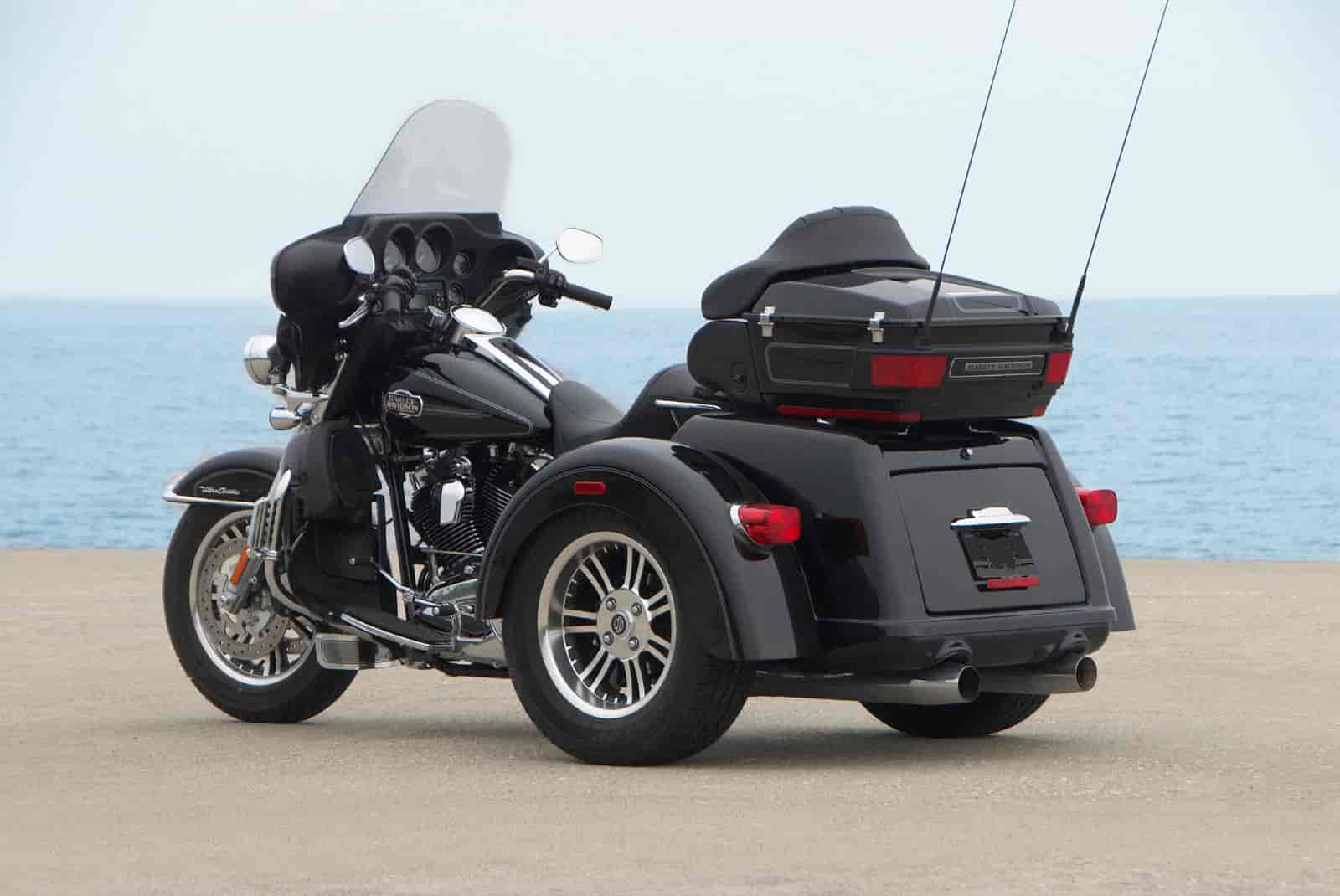 The molded-composite trunk provides 4.5 cubic feet of storage space and can be accessed through a rear hatch. The trunk and Tour Pak have a combined capacity of 6.56 cubic feet and are rated to carry up to 80 pounds. A single key will handle all luggage locking functions, and activate the ignition. Dual mufflers with tapered end caps exit below the trunk. Brake/tail/turn lights are located on each fender, and the Tri Glide retains the Tour Pak lighting used on the Ultra Classic, including the LED side running lights. Matching front and rear black and machined split seven-spoke cast aluminum wheels provide the Tri Glide its integrated and true, factory-built look. The 16-inch front wheel is three inches wide and carries a MT90B16 motorcycle tire, while the 15-inch rear wheels are five inches wide and are fitted with P205/65R15 tires.