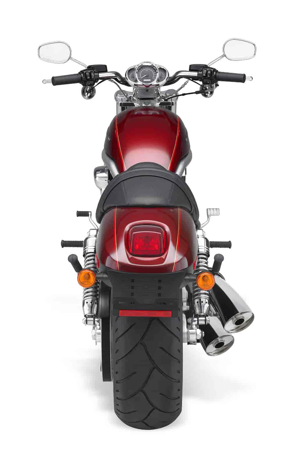 The long profile of a 34-degree fork rake is stretched visually by new “sidepipe” dual exhausts in satin chrome with fat, turn-out mufflers exiting behind the rear axle. The V-Rod Muscle is available in Vivid Black, Brilliant Silver, Dark Blue Denim and Red Hot Sunglo.