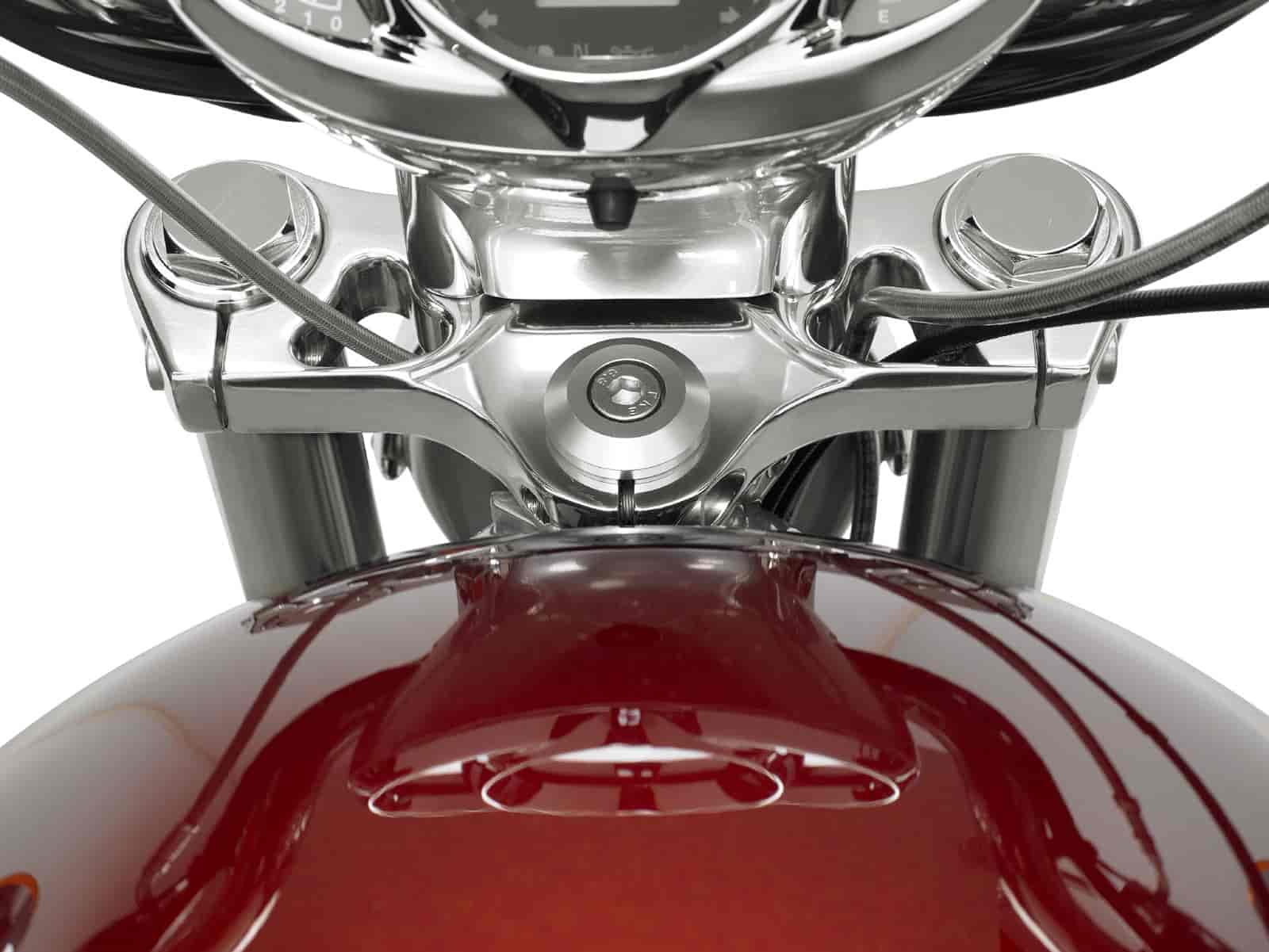 A new deep seat holds the rider firmly in place against the thrust of the Revolution V-Twin engine. The Muscle features forward foot controls, and a new handlebar with internal wiring. The handlebar is 1.5-inch cast aluminum with tubular steel ends and integrated risers. Bold polished forged aluminum triple clamps secure the inverted forks and frame the distinctive V-Rod teardrop reflector optic headlamp, housed in a satin black bucket.