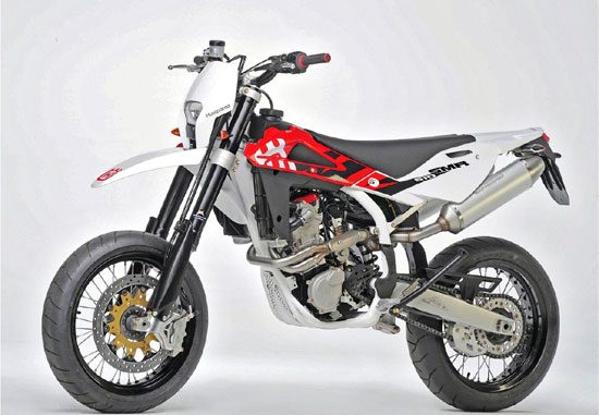 The SM510R evolves for 2009 with the addition of a new twin silencer exhaust system and a new slim line digital dash. The core of the bike stays true to form: super responsive, fuel injected twin cam engine, sub 120kgs dry weight and powerful Brembo brakes all combine to make the SM510R one of, if not the most hardcore road legal Supermoto bikes you can buy today.