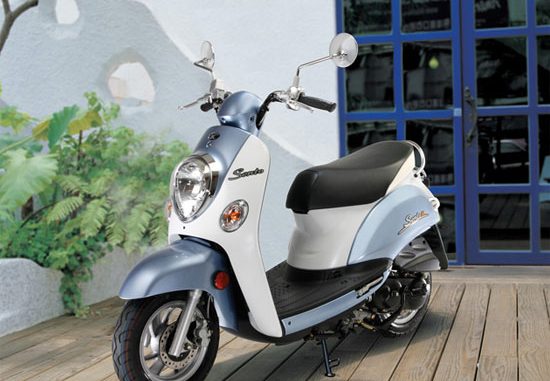 The Sento 50 is a retro-style value leader with traditional 10-inch wheels and a choice of three two-tone color schemes: rose/white, light blue/white, and light brown/white. And while the styling and analog instrumentation may be retro, up-to-date features include electric start, CVT transmission and a front disc brake.
