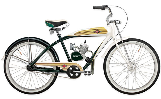 Ridley will be offering two engine kit options. The model 48 kit includes a 49cc- two stroke engine that is capable of speeds around 24 mph. For those a little more daring, the model 49 kit includes a 70cc- two stroke engine that is capable of speeds around 33 mph. Both motors are EPA compliant and offer an estimate 120 mile per gallon efficiency.