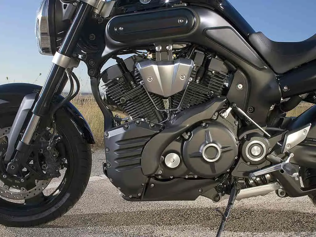 Crankshaft and connecting rod design is unique to the MT-01. Inertia mass is reduced 18% and weight is reduced by 10% compared to the Warrior crank. The crank flywheel shapes are also different.