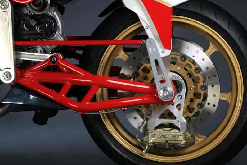 While featuring the original Hub-Steering developed by Bimota, the Tesi 3D Concept boasts several new developments and refinements: The front and rear swing utilize a trellis structure similar to the rear swing of our DB5 and DB6 series’ models. Also the front suspension has been radically redesigned and now uses a pull-rod mechanism with the hydraulic suspension located low beside the engine. Carbon body-parts and cowling, forged alloy wheels, and radial disc brakes are further features of the new TESI 3D. The frame consists of light alloy.