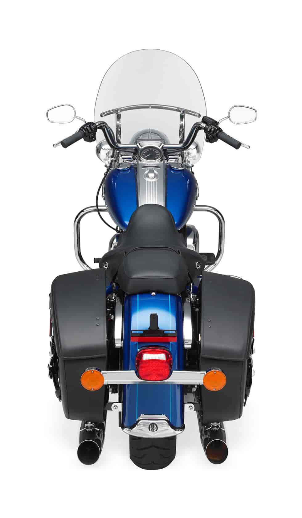 The Road King® Custom offers touring comfort with upscale nostalgic styling, including a tooled leather seat and leather-wrapped saddlebags, wide-whitewall tires and laced wheels.