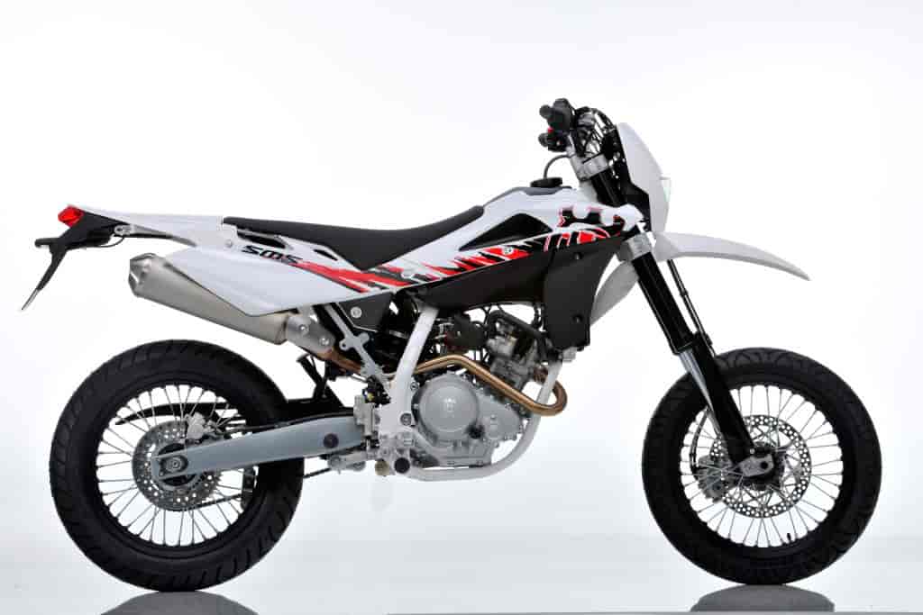 The saddle especially now has double depth padding to provide the rider and passenger with more comfortable seating for medium and long journeys. Passengers will be able to make use of two specially designed handles on the saddle frame that will let allow them to feel both safer and more comfortable. The headlight unit is also new and houses a stronger lamp. This unit is built into the fairing that goes perfectly with the “racing” mudguard. The frame and rear swing arm are now black to contrast with the two new colour schemes available – White and aluminium and black and white. The white and aluminium version is more elegant and sober featuring “in mould” plastic decorations. The black and white version is sportier and more aggressive with fully painted bodywork. The rear mudguard is also new with LED lights and a built-in number plate holder. The main news item on the new SM 630 is the engine that has been bored out from 98 to 100 mm to give a capacity of 600cc The head now has a red rocker box like the race machines and houses DOHC valve gear from the racing 450/510 that provides 20% more power than the previous 570cc version. The SM 610 i.e. now has an electronic injection system that was developed in collaboration with Mikuni. The engine now features a 45 mm throttle body with the starter command on the handlebars and there is a 300 Kpa Mitsubishi “twin jet” fuel injector fitted to the throttle. The pressure regulator (3 Bar) regulates any return of excess fuel to the tank and the MAQS (Modularised Air Quantity Sensor) consists of air temperature, mapping and TPS (Throttle Position Sensor) sensors. The Kokusan 360W three-phase ignition flywheel is also new. The water temperature sensor is positioned on the head. The injection ECU processes signals and governs the operation of the solenoid-operated valve fitted to the right hand side of the radiator. The cooling system has a new impeller and pump body. The clutch is hydraulically operated and the left cover plate has been redesigned. New components include the rugged 12 litre polyethylene petrol tank with a 40l/h pump; the non-return fuel circuit has quick-fit connections. The exhaust system on the four-stroke single cylinder engine has a “closed loop” lambda probe and the twin aluminium silencers feature catalysers that have been redesigned and optimised to meet Euro 3 requirements. The areas on the silencers that houses the catalysers and around the passenger footpegs have been covered with stainless steel protection. The chassis can be fitted with a main stand that is available as an optional extra. As regards the brakes – the front now has a radial race-derived Brembo caliper acting on a floating 320 mm disc while the rear has a 220 mm Brembo disc with a single piston caliper. The suspension remains unchanged except for the Marzocchi forks that now have the same black sleeves as on the 450 and 510 models. The 2010 version of the SM 630 will have Tommaselli tapered handlebars with new steering head clamps and no cross bar. Dry weight is 158 Kg.