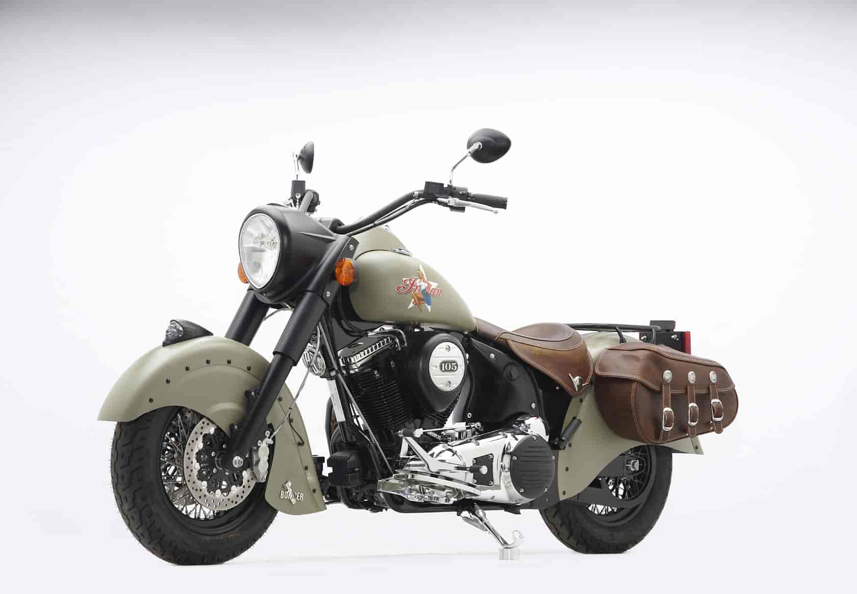 Inspired by WWII aircraft, the Bomber is a limited edition Chief model and will only be available for one year. The Bomber is available in Military Green and Silver Smoke finishes. The pin-up girl tank artwork is inspired by the Bomber nose art of that era. The leather used on the seat and saddlebags are reminiscent of the feel and color of an old bomber jacket. The price of the Bomber is $30,999.