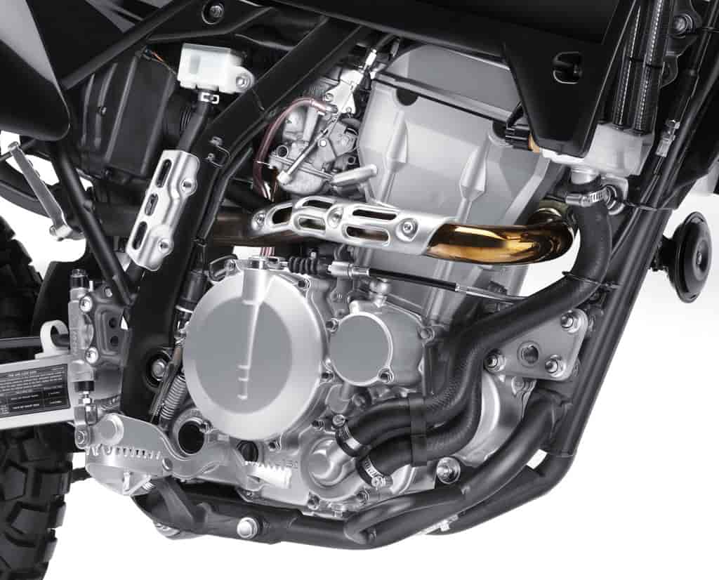 The KLX250S is powered by a compact liquid-cooled, 4-stroke, single cylinder engine. With a bore and stroke of 72 x 61.2 mm, the engine displaces 249 cc.