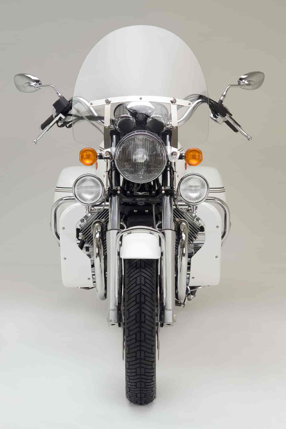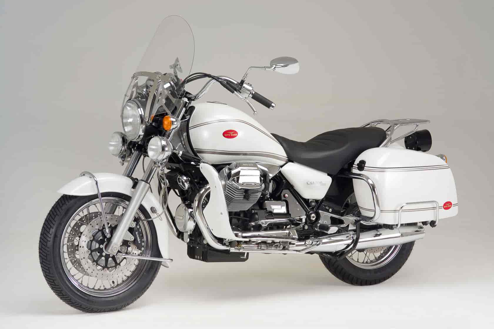 Over thirty-five years have gone by since its introduction, but the Moto Guzzi California continues to play a leading role in the collective imagination of motorcyclists all over the world. When the California was first introduced back in 1971, the market for customs was split between original motorcycles and Japanese imitations. But then Moto Guzzi introduced a machine with a powerful personality, based on the tried and tested frame of the V7 Special and the legendary 90° V twin engine, with a capacity of 757 cc. This frame/engine combination proved such a tremendous international success that it was eagerly adopted by the L.A.P.D. (Los Angeles Police Department), and later by police departments in other American States. The rest is history – and legend. A familiar protagonist in films and advertisements, the California has every right to be considered as one of the few objects of industrial design that have left a permanent mark. The California’s wheels have never stopped, and neither has its development. Year after year, the bike’s looks and technology have been updated without altering its original character and spirit. Now, 35 years after its introduction, Moto Guzzi has decided to pay tribute to the amazing California by creating an exclusive Vintage version, dedicated to modern riders who want to continue the dream. The styling is obviously retro, as you can see from the stunning spoked wheels, redesigned steel mudguards, new Brembo front calipers, supplementary fog lights controlled from the right hand switch block, windshield with stainless steel trim, shiny chrome handlebars and two-tone seat. The fixed panniers are a further sign of distinction. Made from rotational nylon, they are fully waterproof with inner linings, and are protected against impact by robust chromed steel tube of the same type used for the luggage rack.