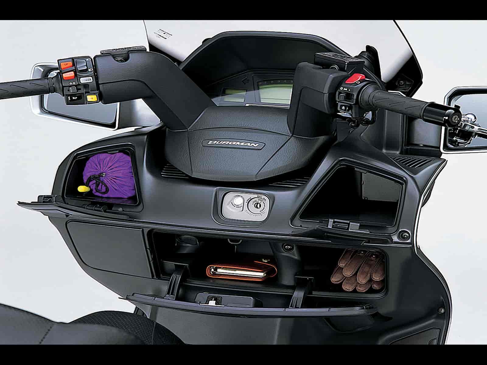 The stylish Burgman 650 Executive, it has all the great features of the Burgman 650 with ABS, an electic adjustable windshield and a passenger backrest. With the largest engine in its class, the Burgman 650 rewards you with strong acceleration around town or on the highway. Its refined fuel injection system offers instantaneous throttle response. And, for convenient operation and incredibly smooth performance, it has a technically advanced Suzuki Electronically Controlled Continuously Variable Transmission (SECVTTM). Wherever you ride, you and your passenger will appreciate the smooth, comfortable ride, plush, responsive suspension, and a deep, well-padded seat complete with a backrest for the rider. Large floorboards and spacious ergonomics further contribute to your comfort. The Burgman 650 is as practical as it is stylish. It has terrific storage space, including a cavernous underseat storage area capable of holding two full-coverage helmets. What’s more, three front compartments with lids allow easy storage of and access to your smaller items.