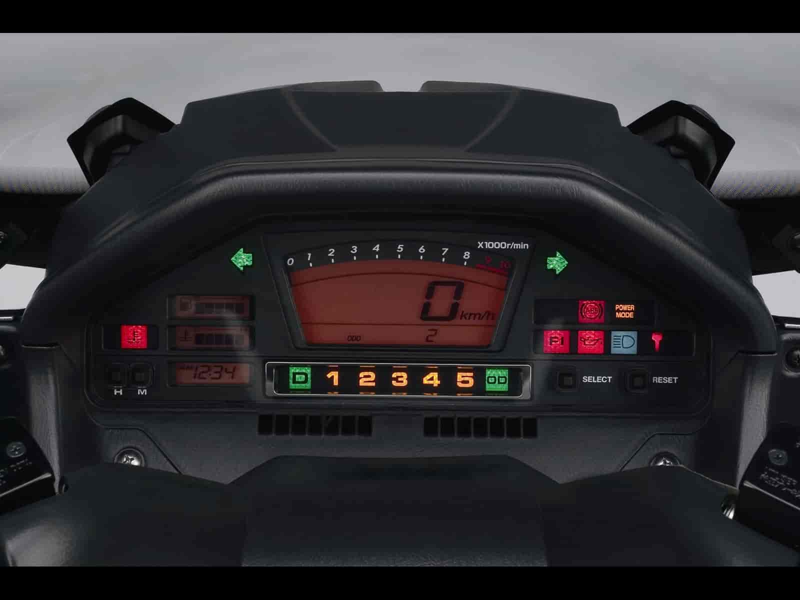 Automotive-style instrument display with analog tachometer, speedometer, fuel gauge, temperature gauge, plus LCD odometer/tripmeters and clock