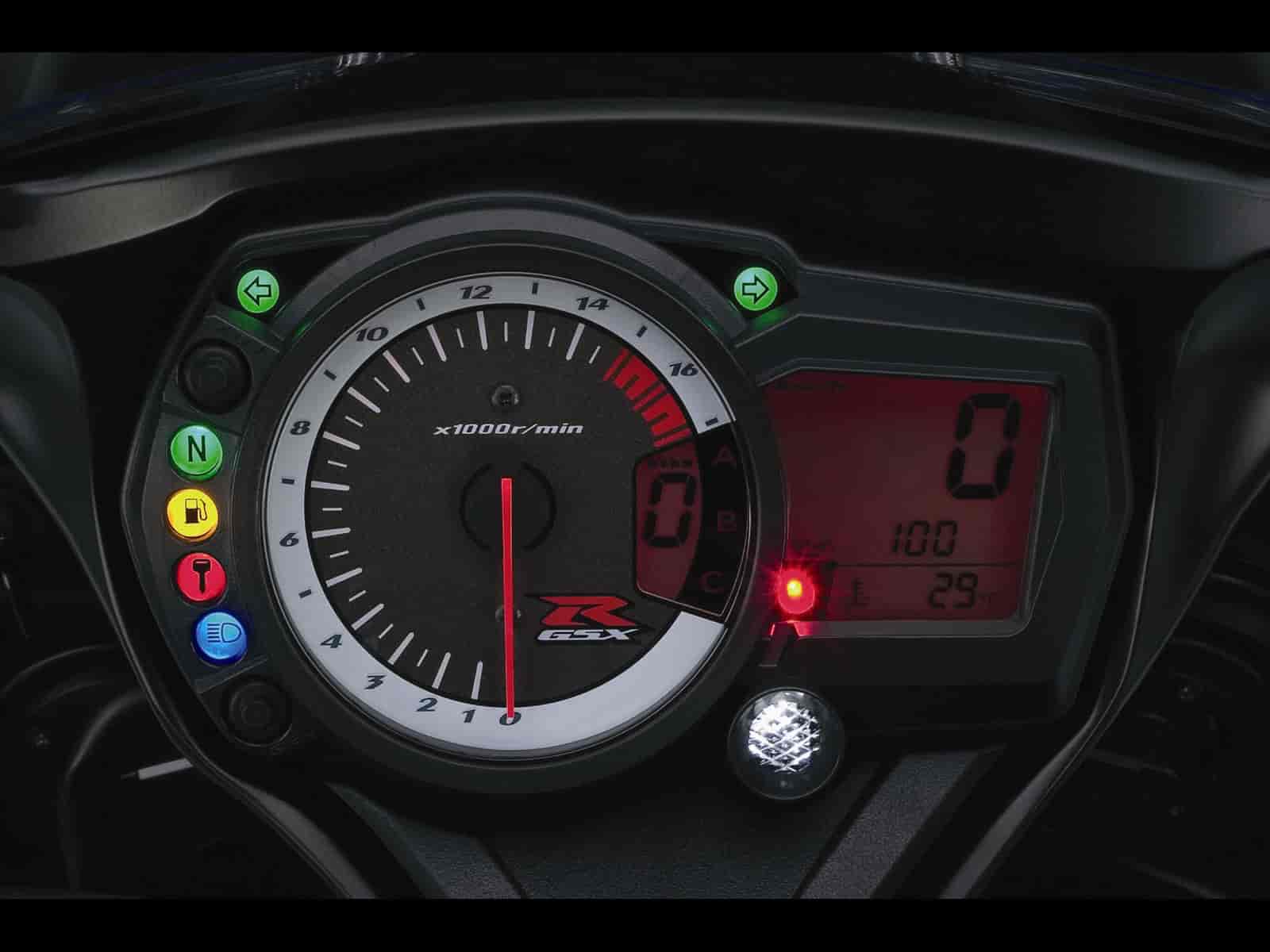 Instruments – The compact lightweight instrument cluster features a step motor controlled analog tach, LCD speedometer, dual tripmeters, clock, fuel reserve and a gear position indicator