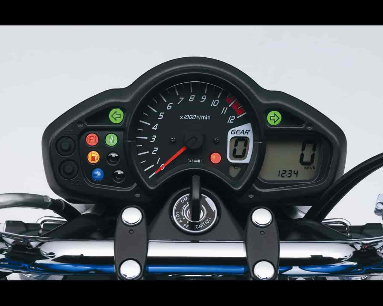 Instrument cluster is positioned above the headlight and provides an analog tachometer, LCD digital speedometer, LCD dual trip-meters and odometer. An LCD digital clock, and LCD digital gear position indicator are also featured. Indicator lights include a two way remaining fuel warning lamp, backed up by an LCD digital reserve trip meter.
