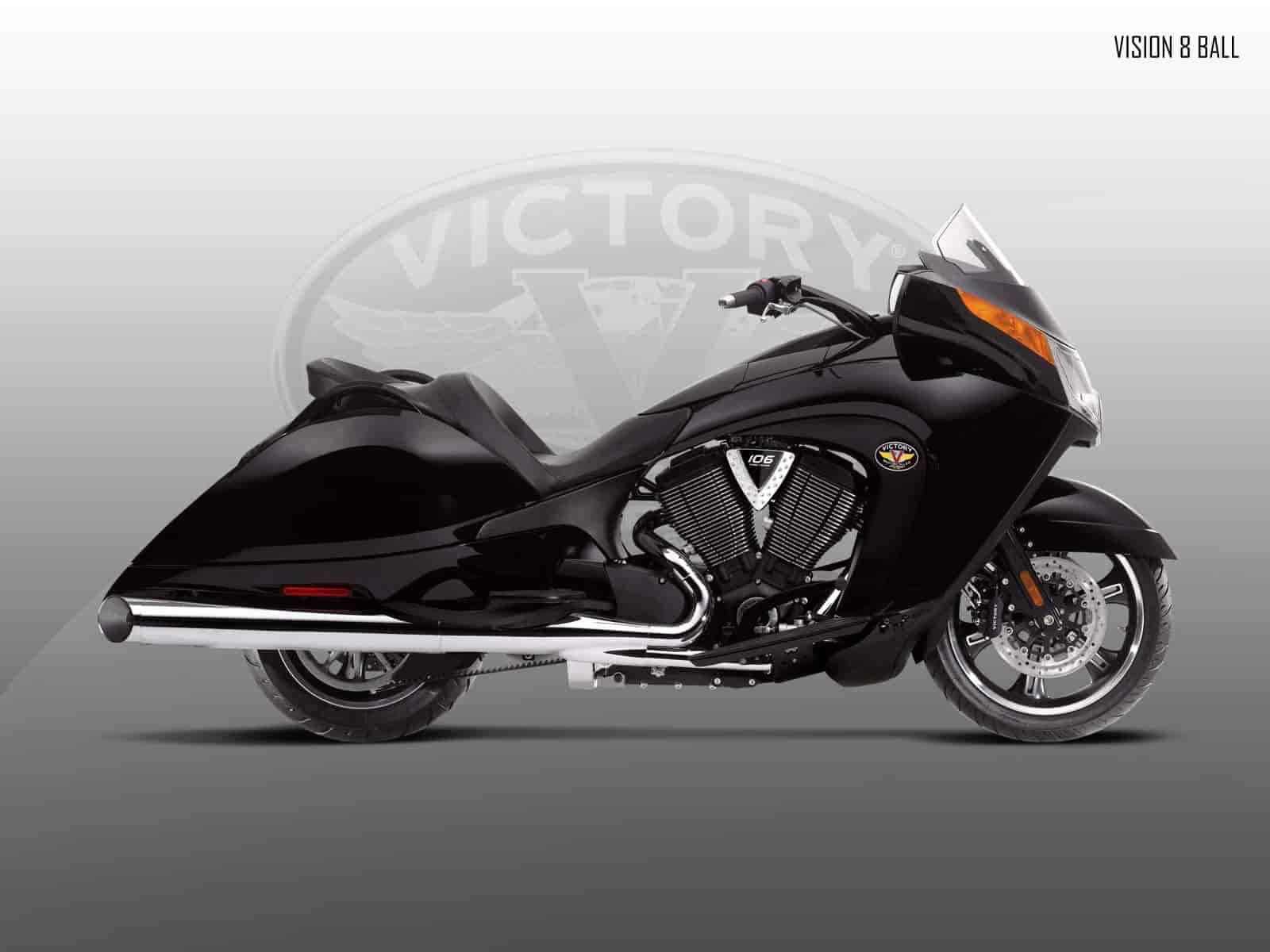 New for 2010, the Victory Vision® 8-Ball Motorcycle is a blacked-out distance cruiser motorcycle for those riders who like streamlined touring motorcycle riding. Its style & performance are awesome and its value can’t be denied. The Victory Vision® 8-Ball is a no-frills cruiser motorcycle that hits the open road with only the essentials. It has a powerful Freedom® V-Twin Engine, blacked-out features and side storage.