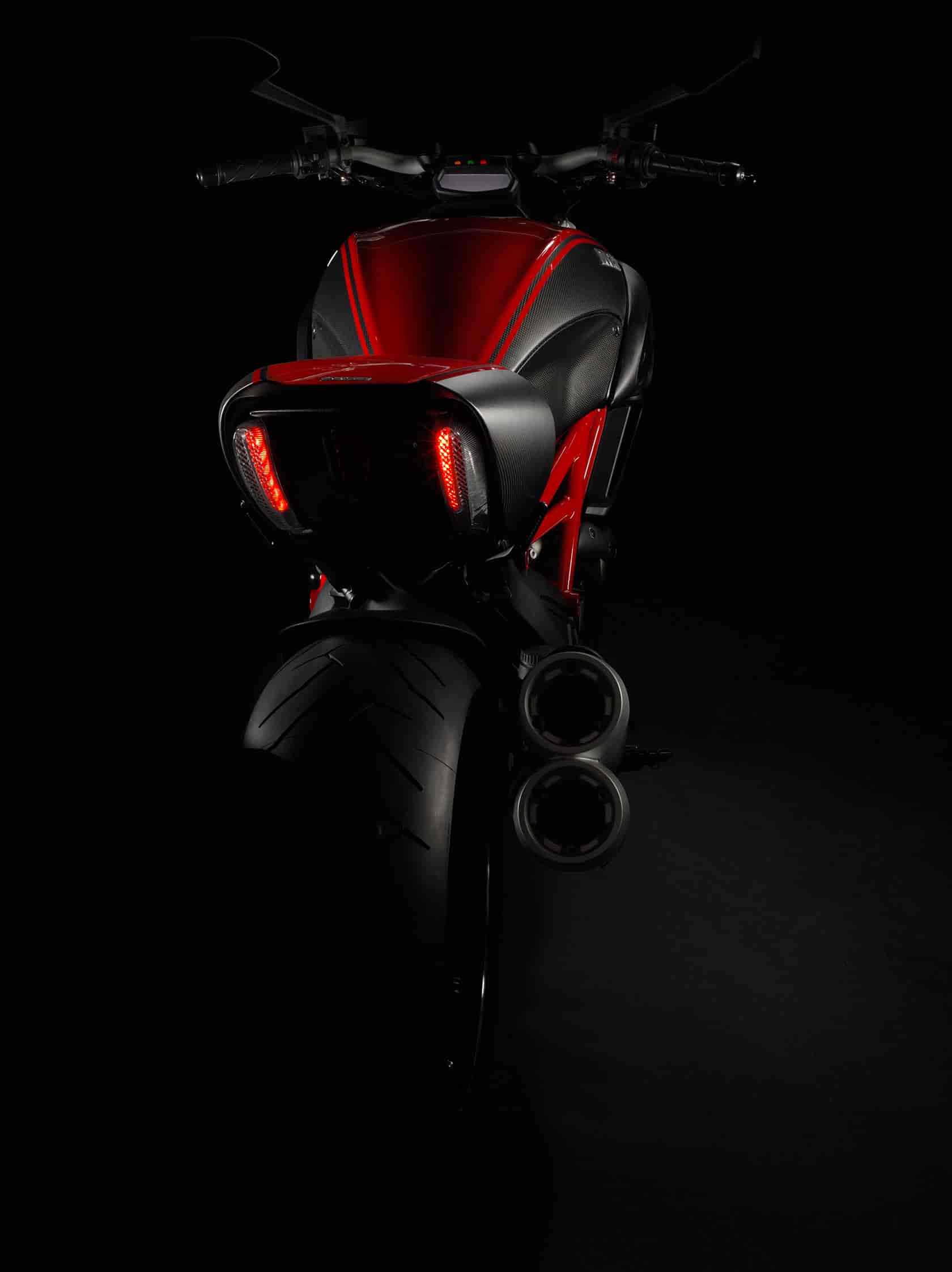 The Diavel uses two clear vertical strips of LED lighting to provide tail and brake light illumination as well as directional indicators.
