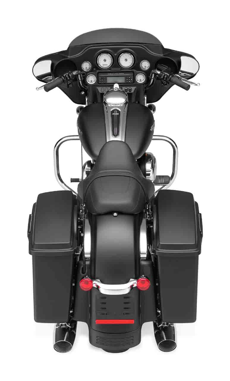 The rear suspension is lowered by one inch, so the Street Glide model appears to hug the highway, a look that is reinforced by the “ground effects” trim at the bottom edge of the rear fender.