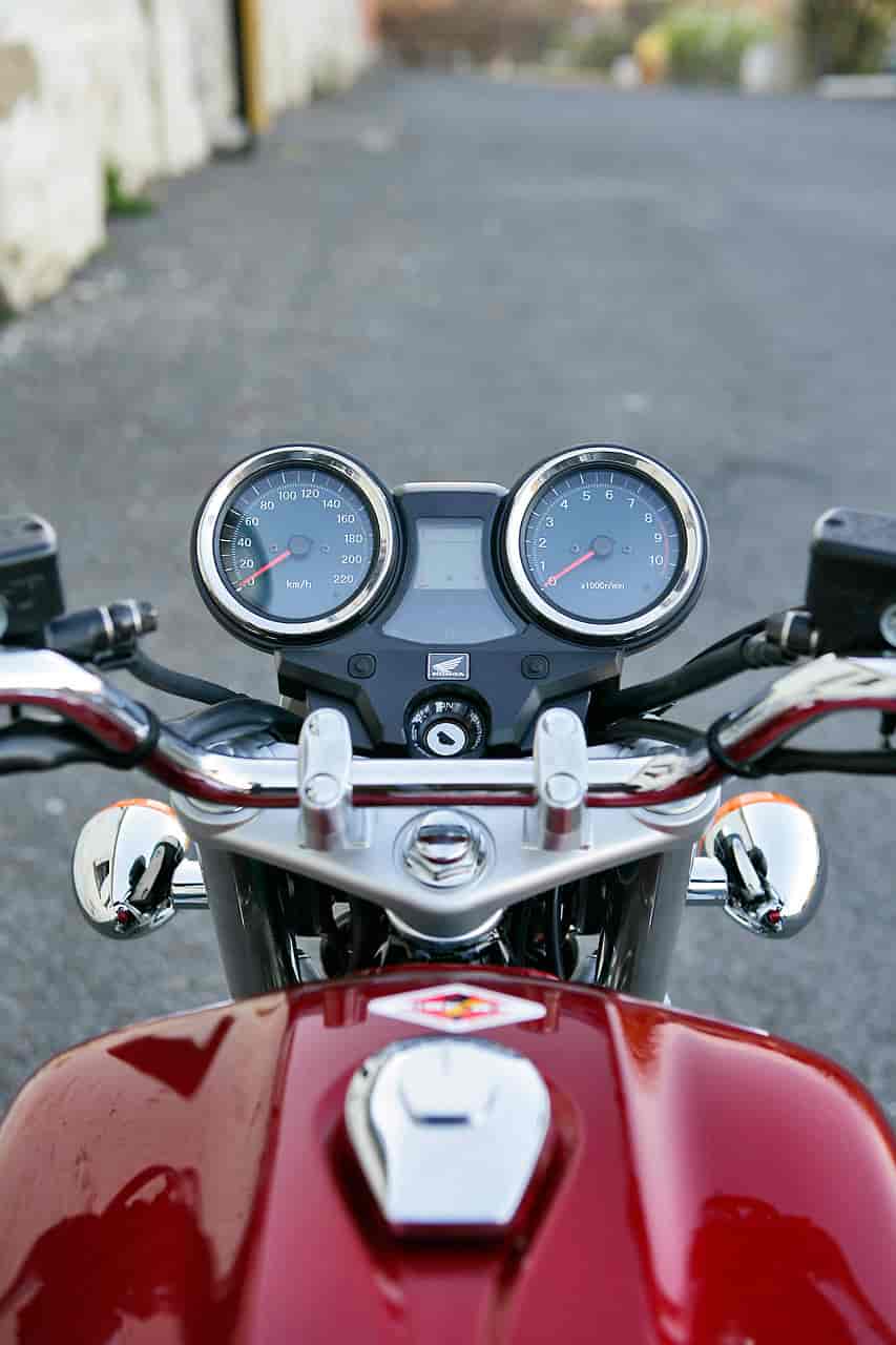 The clean, simple wheels integrated with the front brake disc carriers, the analog clocks with the large digital readout in the middle, the aircraft-style fuel filler cap, the minimalist seat and the Honda badges all give the CB1100F a unique vintage look whilst incorporating all the mod cons of a new bike.