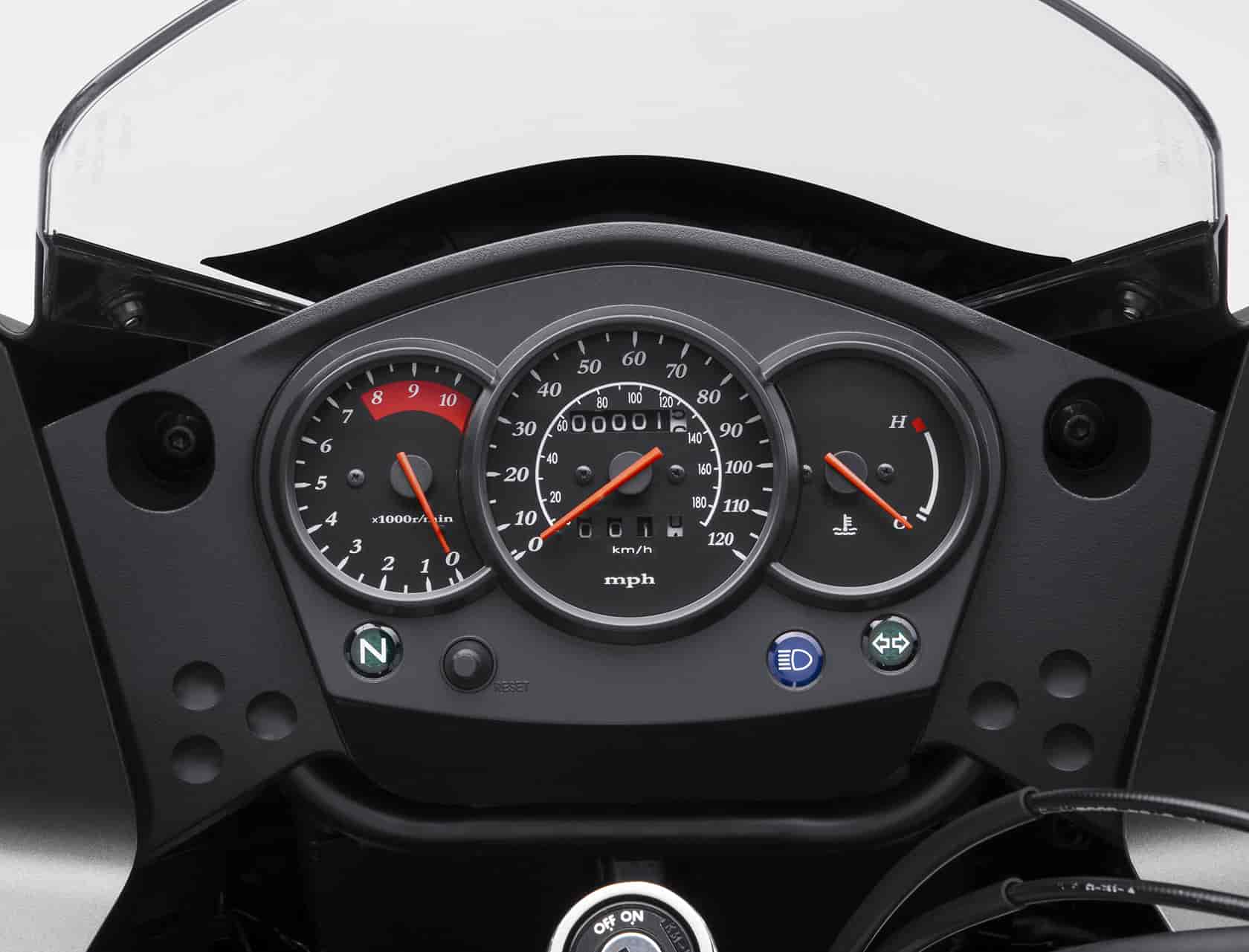– Easy-to-read instrument panel is mounted to the frame and includes a large-face speedometer, tachometer, odometer, trip meter and water temperature gauge