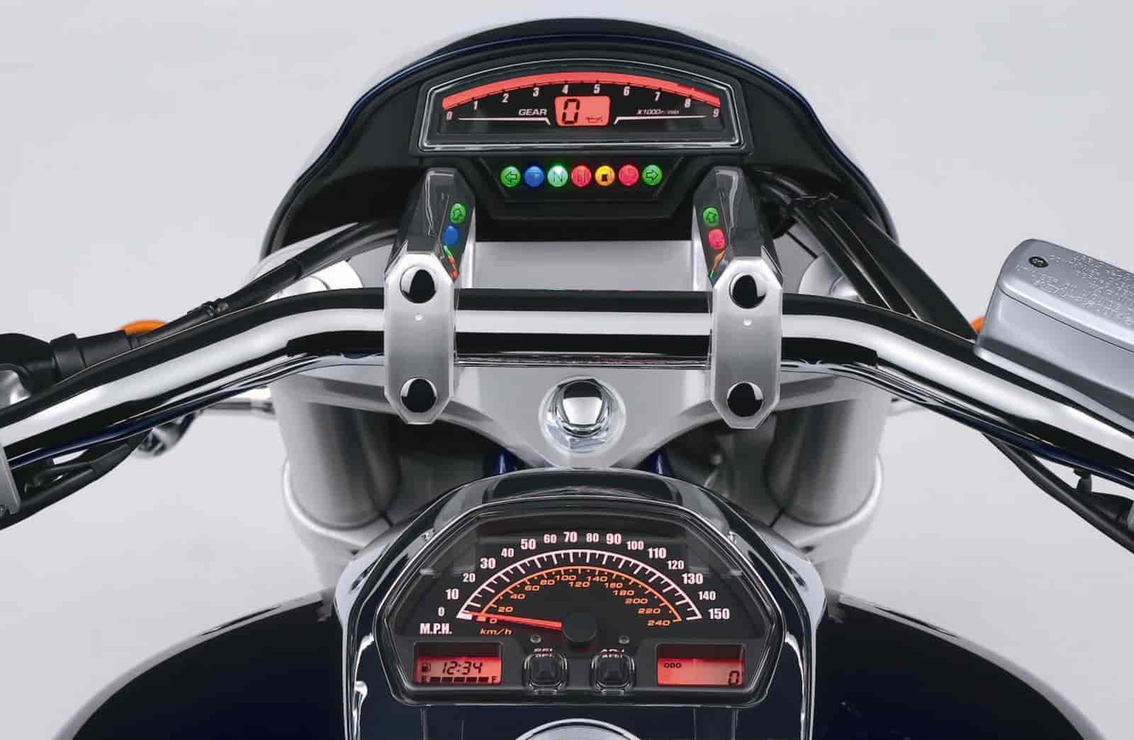 The Boulevard M109R features a new instrument cluster with a digital tachometer and LED indicator light; a newly included gear position indicator; and it is now relocated from the handlebars to the top of the headlight cowl.