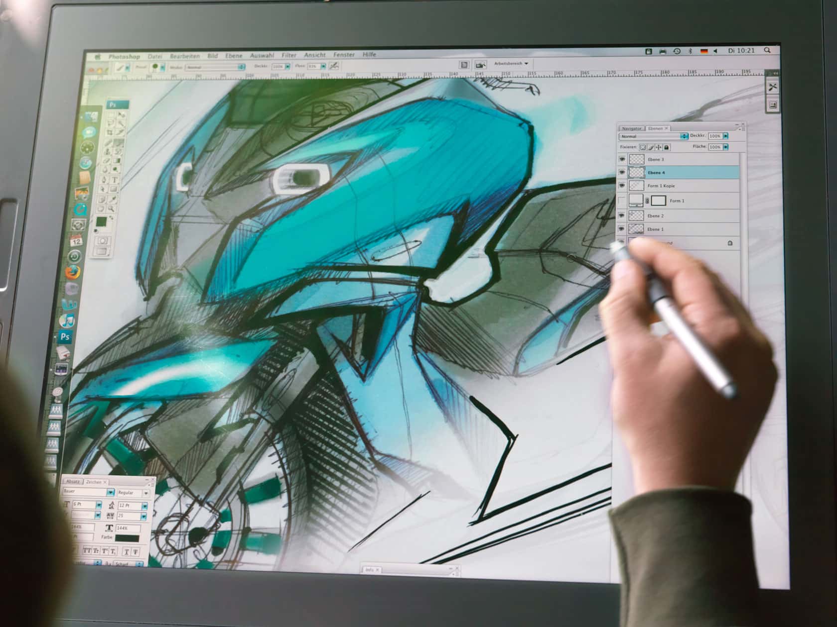 For instance, Concept C features a highly complex monolever mechanism with hollowed-out shaft connected to a suspension strut visible from the outside. In this study, front-wheel control takes the form of an upside down fork.