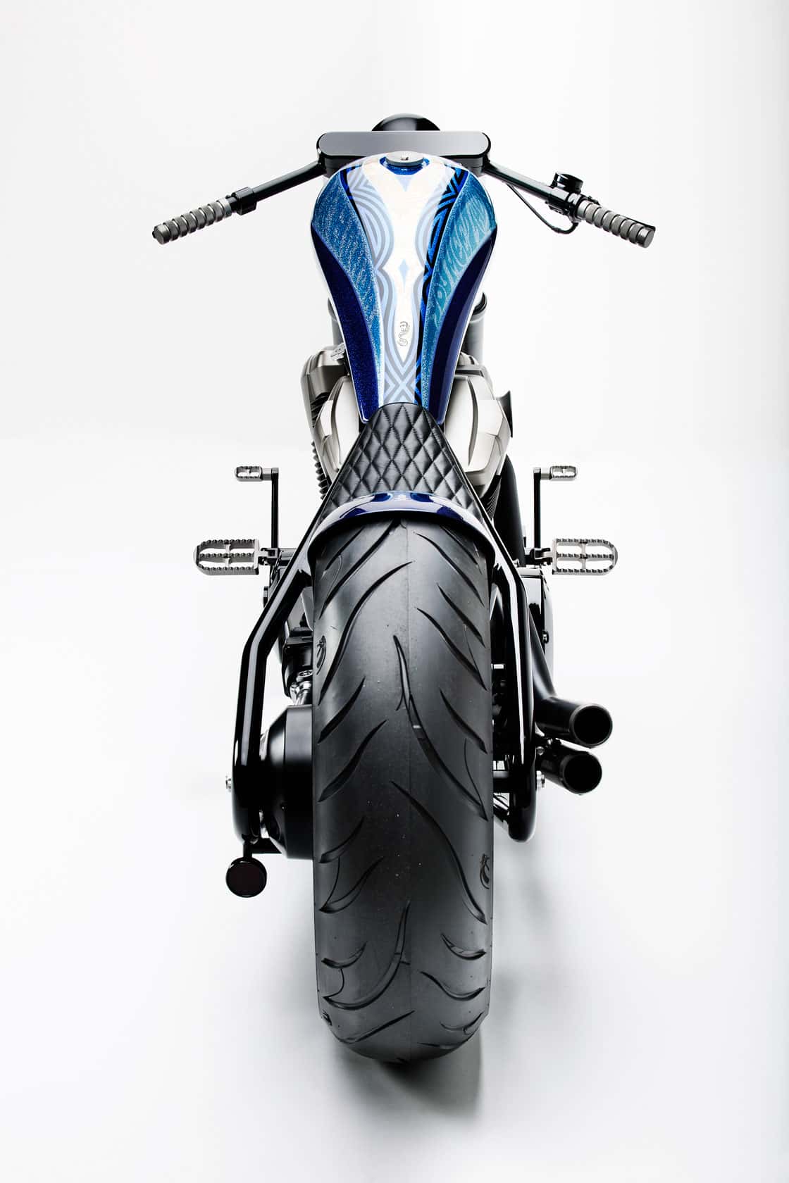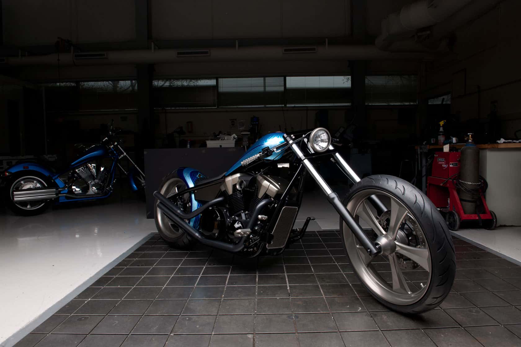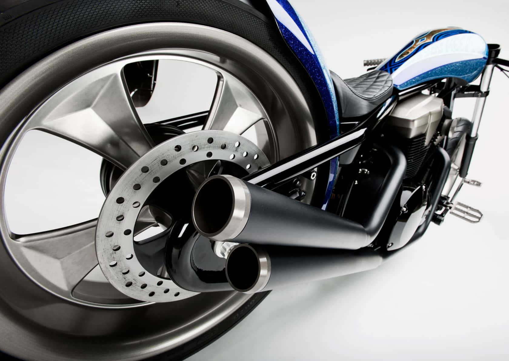 Based on the 2010 Fury, Nick Renner (Honda R&D Americas) introduces “Furious”, a bold blend of new and old school flavor. Pounding the street with a 23 inch wheel up front and a 20 on the rear, Furious makes no apologies. 45 degree rake and converted hard tail create a clean, pure statement that is simply chopper. Metal flake, variegated leafing, and diamond stitched seat contrast with the five spoke crushers and Fury tank. Long and low, clean and mean… Furious is an instant Neo-Classic.
